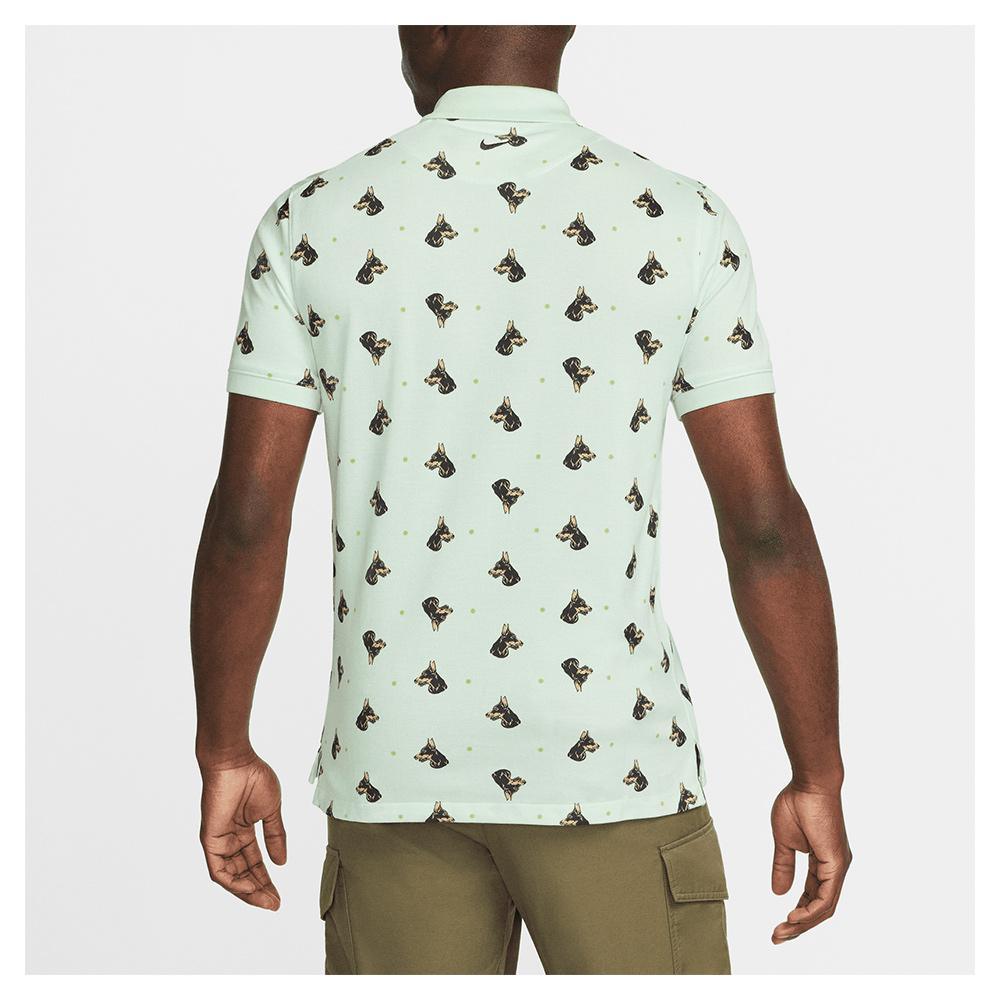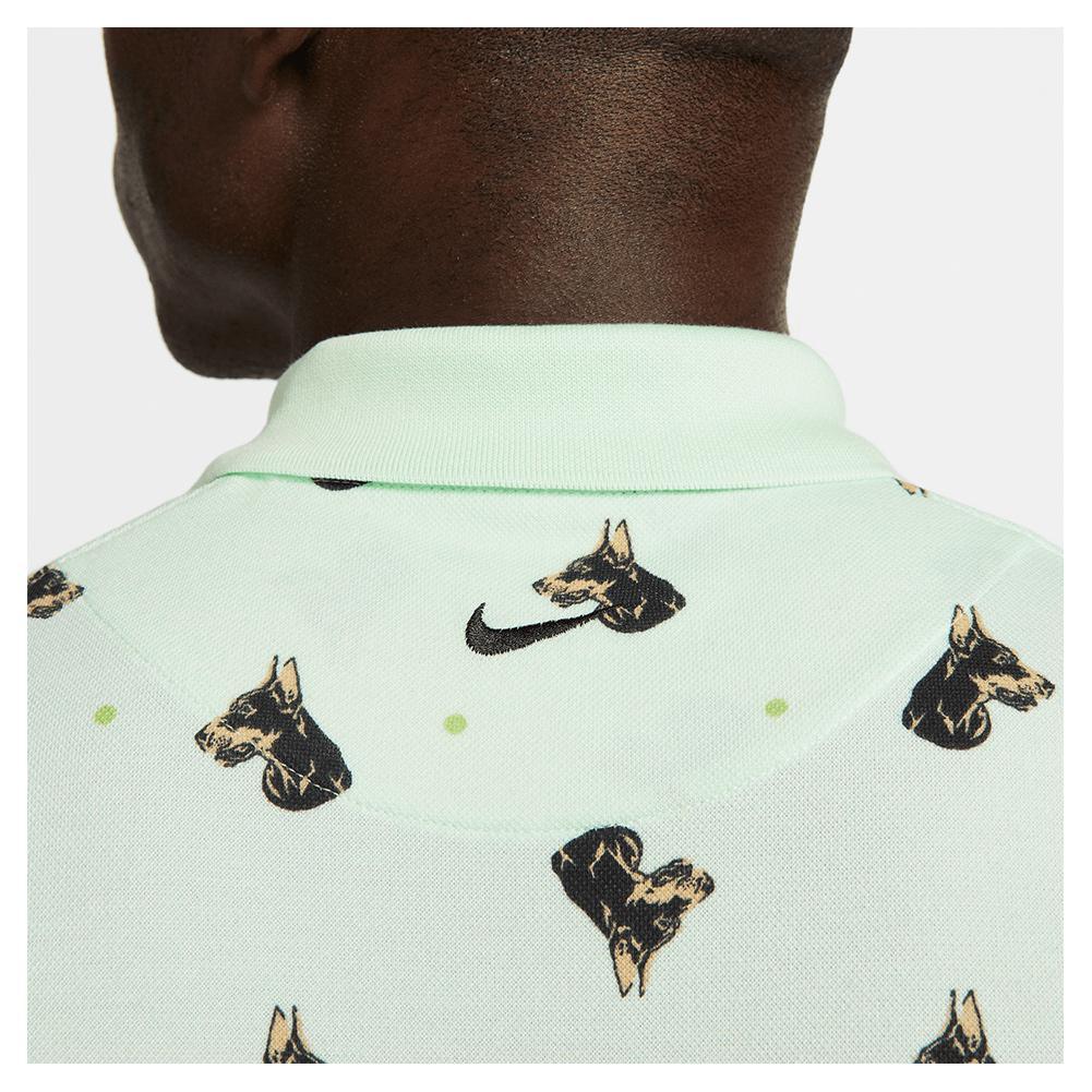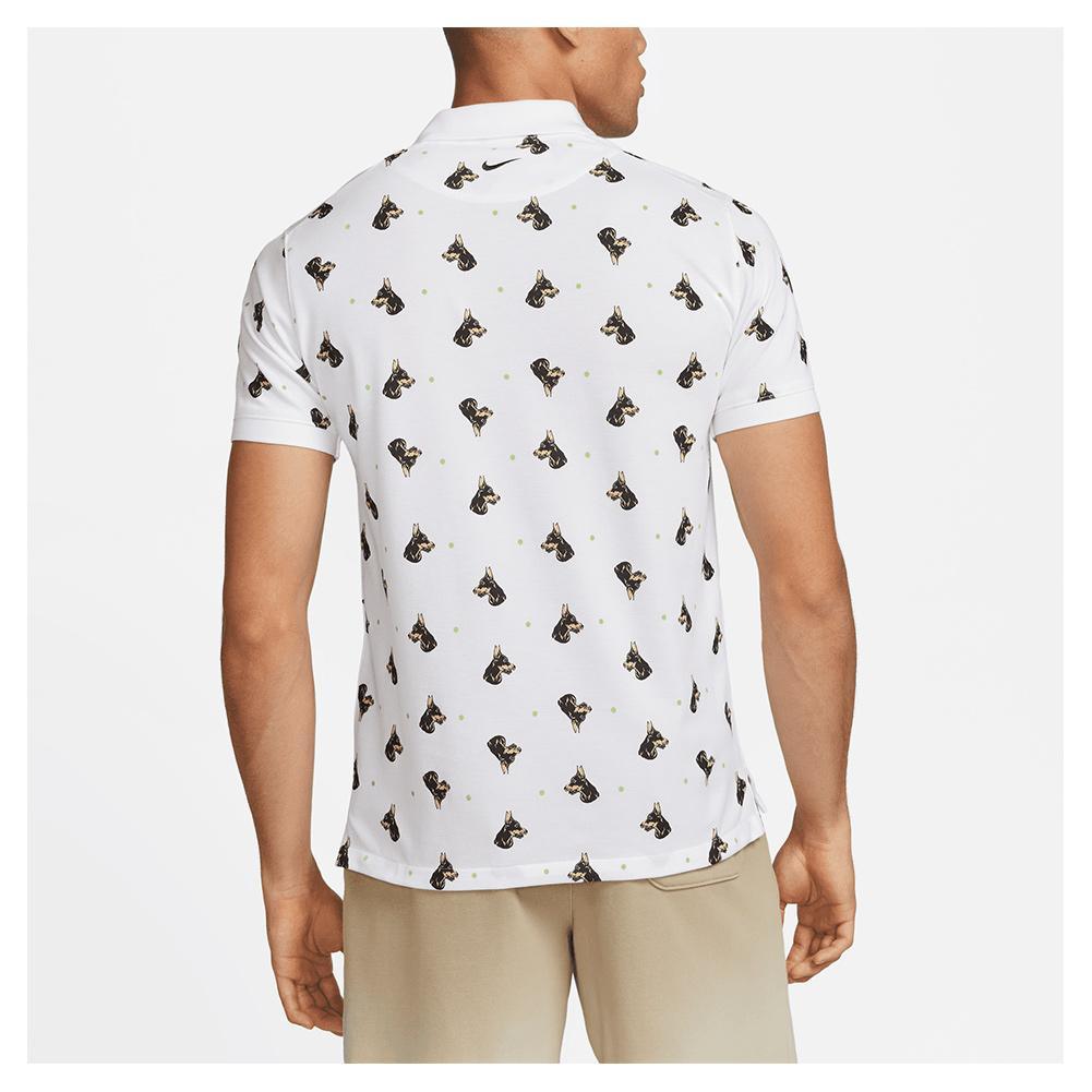 Rejoice as the dog days are over with the Nike Men's Printed Slim-Fit Tennis Polo. This shirt features an all-over dog print that everyone will fall in love with. Its pique fabric is designed with a breathable knit and uses Dri-FIT technology to wick away sweat, and embroidered eyelets at the underarms improve airflow for more comfort. To create a more casual look, the extended back hem and side slits let you wear the shirt untucked with confidence. Finally, an orange placket label, orange top button thread, and Nike shoebox patch under the back label work together to bring out the signature Nike Heritage look.