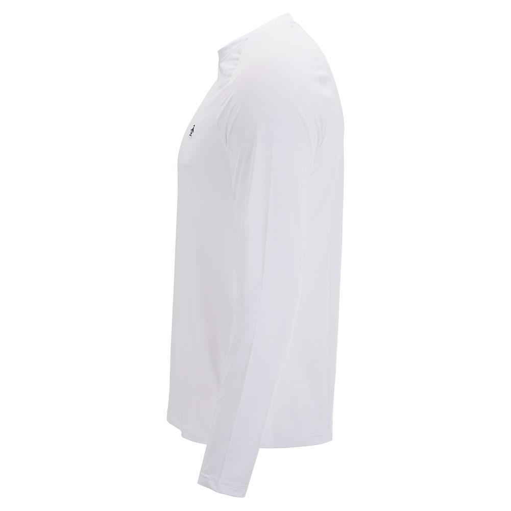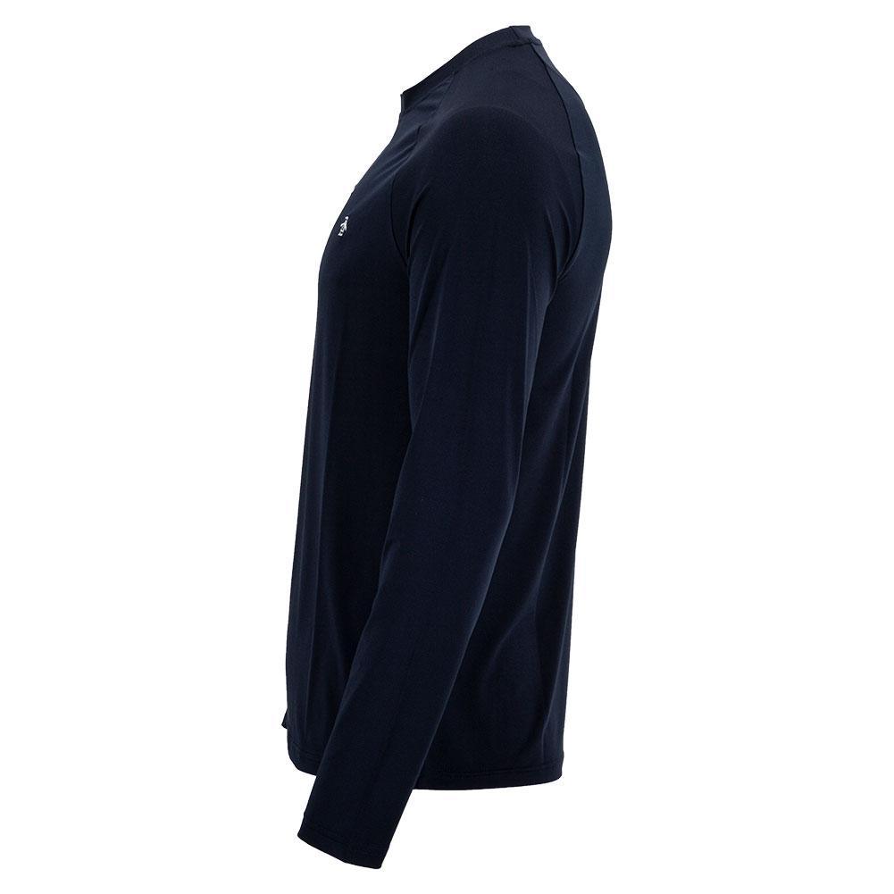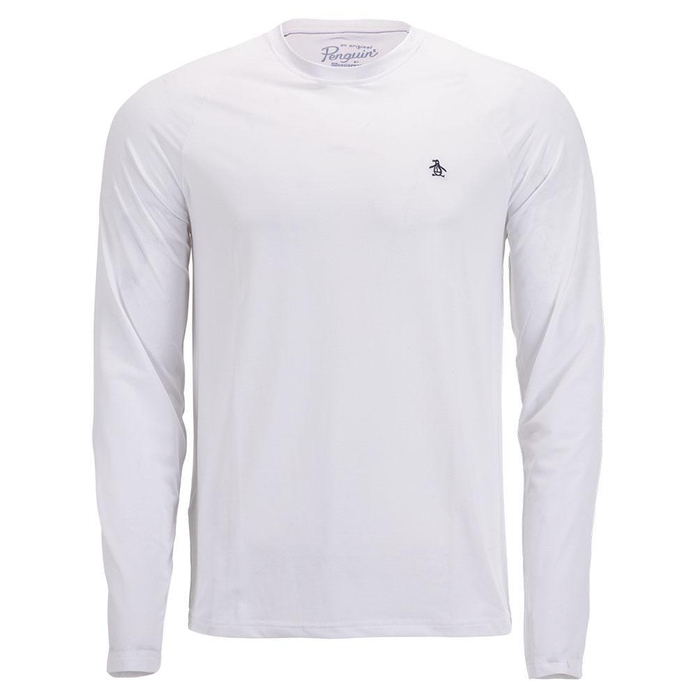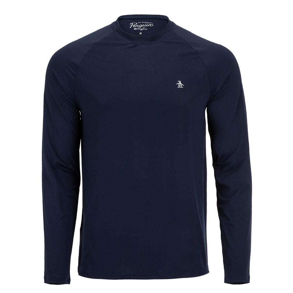 Suit up this fall with the Penguin Men's Raglan Long Sleeve Tennis Pull Over in Delphinium Blue. The crew neck top makes it easy to slip in and out of easily. Raglan-style sleeves are shaped naturally with your arms, letting you move more freely and with confidence. Made with high gauge ventilated fabric, this shirt is very breathable and comfortable. The high-quality, recycled material blend is flexible and minimizes your impact on the environment.