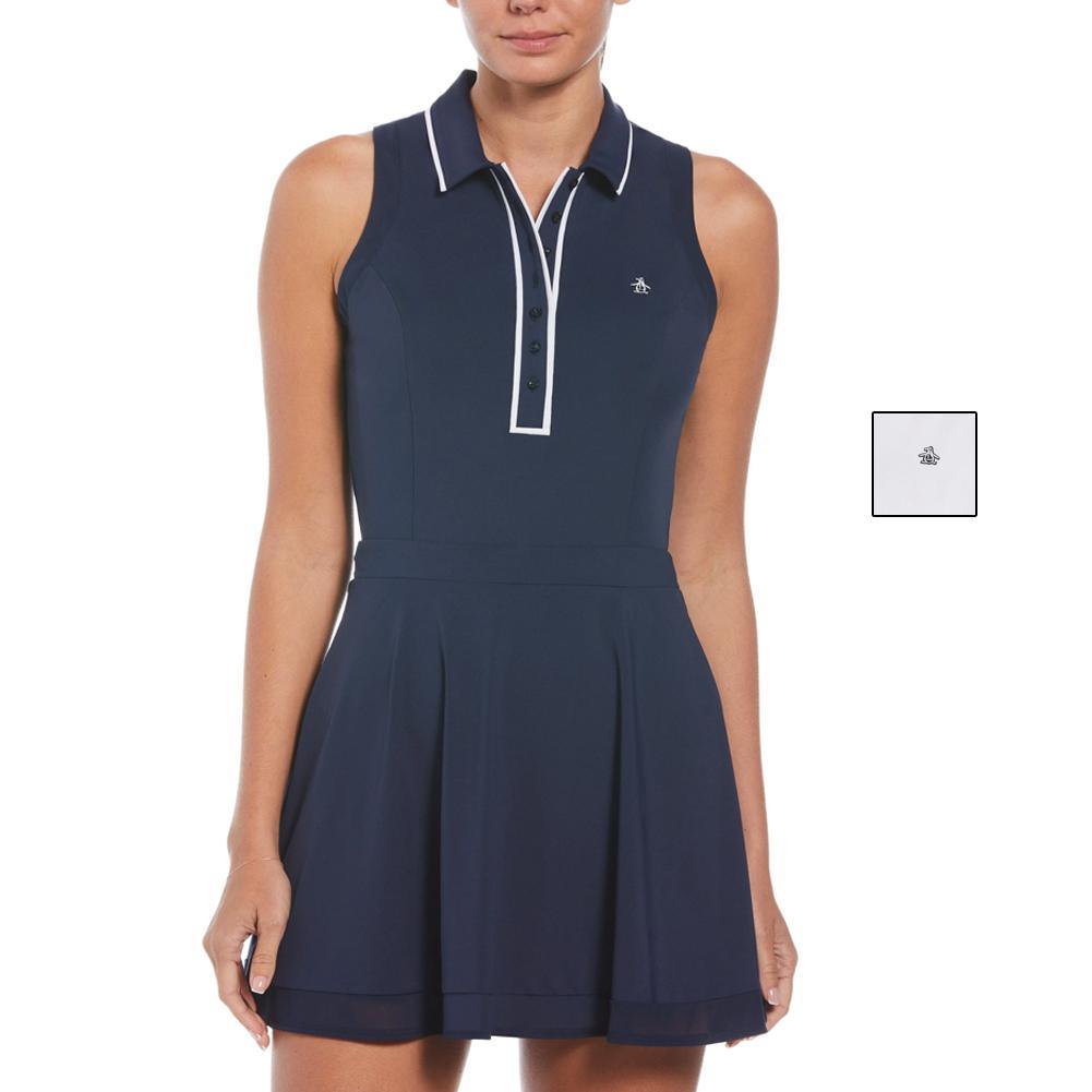 Improve your play in the Penguin Women's Sleeveless Veronica Tennis Dress! The five-button placket allows you to adjust your neckline to sit at the level you prefer. The contrasting white seams against the black fabric give the dress a classy look. The sleeveless design is perfect for sunny days! The removable internal shorts offer extra coverage to accommodate your varying activities. The mesh sleeve and hem enhance the breathability of the dress, keeping you cool and fresh throughout your play.