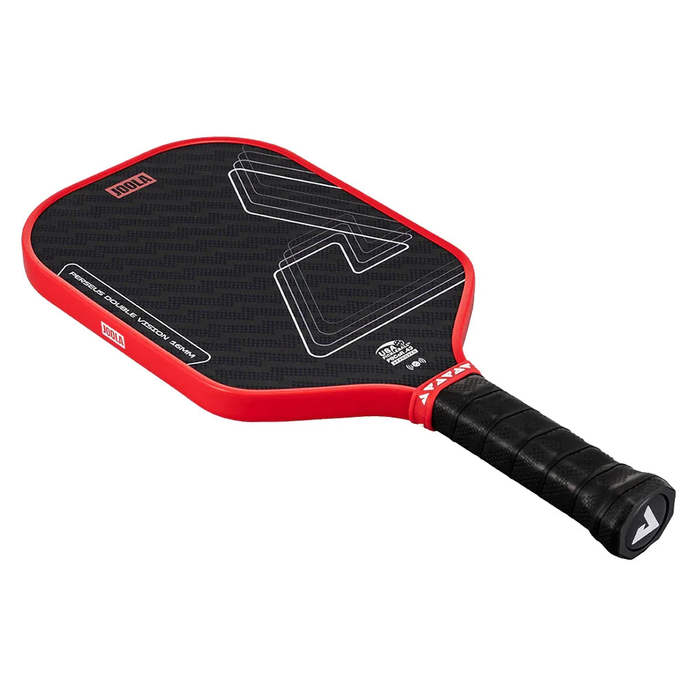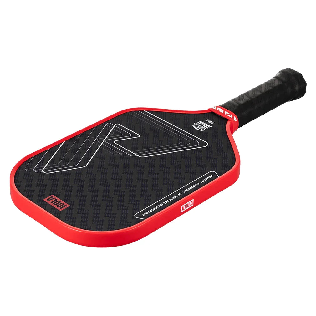 The Joola Perseus Double Vision 16mm Pickleball Paddle has an elongated and squared head shape for those who want power with a bit of consistency. Its textured, aramid surface enables spin generation to make winning shots even trickier to handle. A thermoformed edge wall at the neck provides extra stability and flexibility, while a special layer of SK Film between the core and hitting surface improves the sweet spot for more generous control.