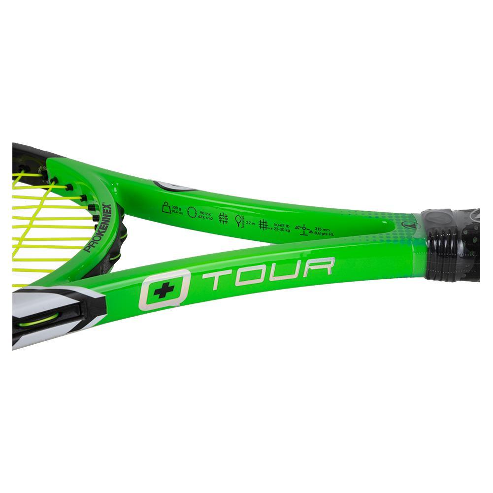 The ProKennex Ki Q+Tour Tennis Racquet get updated in a flashy green and it continues to be the brands' most impressive control series The Ki Q+Tour has a 19 mm beam, a 16x19 string pattern, and a low 10.6 ounce unstrung weight that meets the demands of players who need control above all else. The racquet features ProKennex' Kinetic system with a Quad Focus design which features moveable microbearings in isolated chambers throughout the frame and in the butt cap. The tech is unique within the tennis industry, and is designed for improved comfort, stability, and feel. Pro Kennex SpiralTech Carbon is denser than standard graphite and it is more solid at contact as well. Advanced players seeking a thin beam control racquet with high marks for comfort and mobility, will love the Ki Q+ Tour.