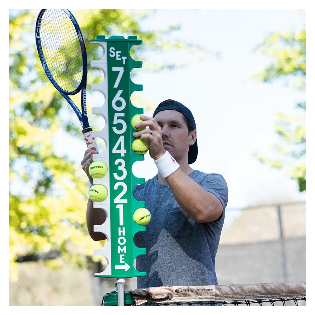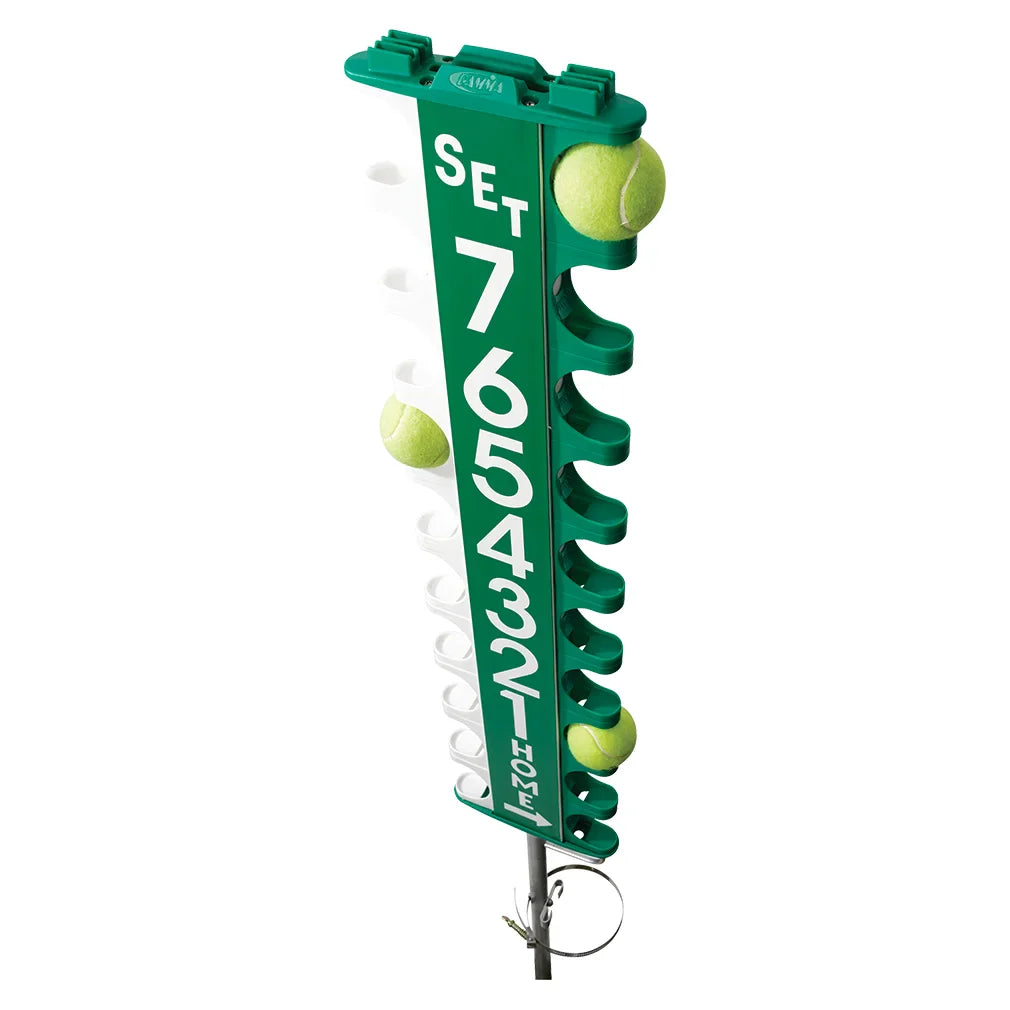 The Gamma Score-Post Pro uses tennis balls to keep track of the score with standard 2 out 3 traditional sets or an 8-game pro set. The Score-Post Pro ships with an all-metal support that attaches to the net post with quick release hose clamps for easy court change over (no tools needed). Scor-Post Name Cards are sold separately.