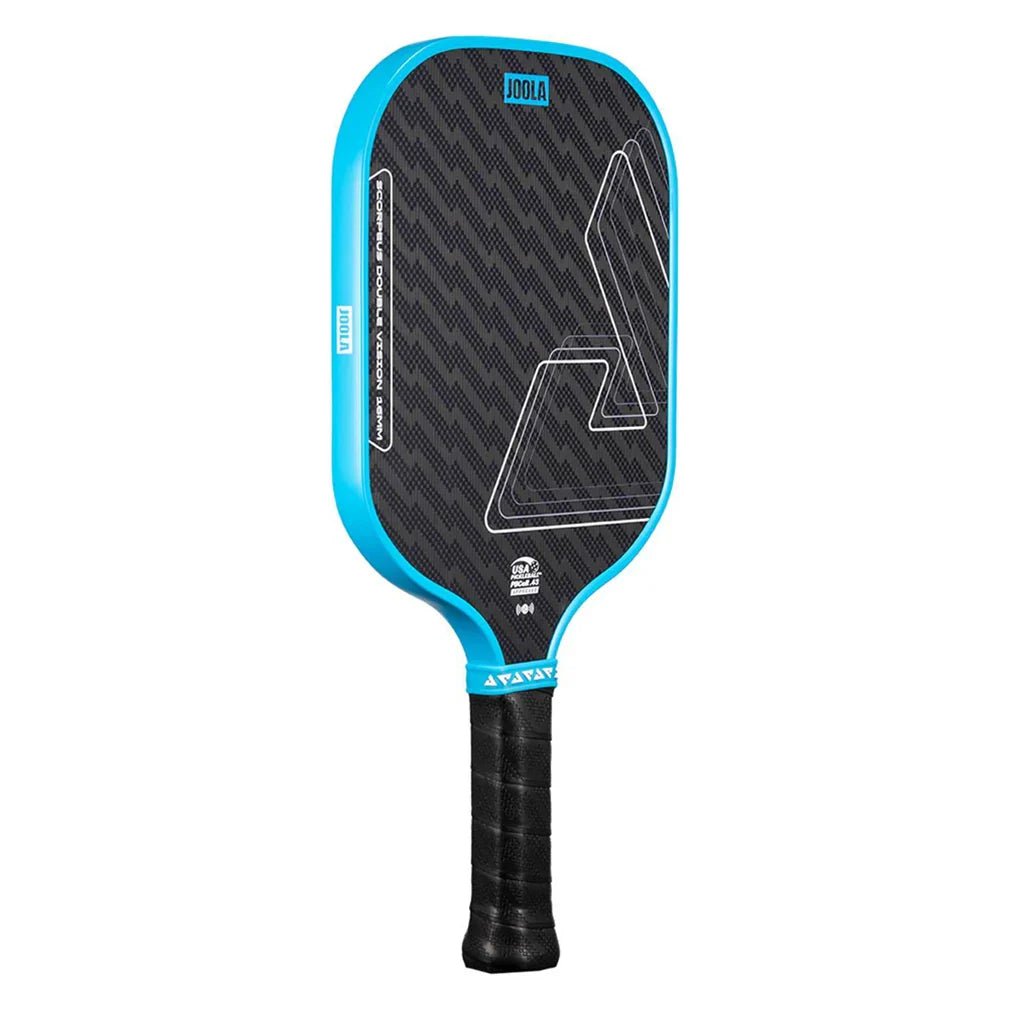 The Joola Scorpeus Double Vision 16mm Pickleball Paddle uses its wide surface and sweet spot to strike a balance between control and power.. Its textured, aramid surface enables spin generation to make winning shots even trickier to handle. A thermoformed edge wall at the neck provides extra stability and flexibility, while a special layer of SK Film between the core and hitting surface improves the sweet spot for more generous control.