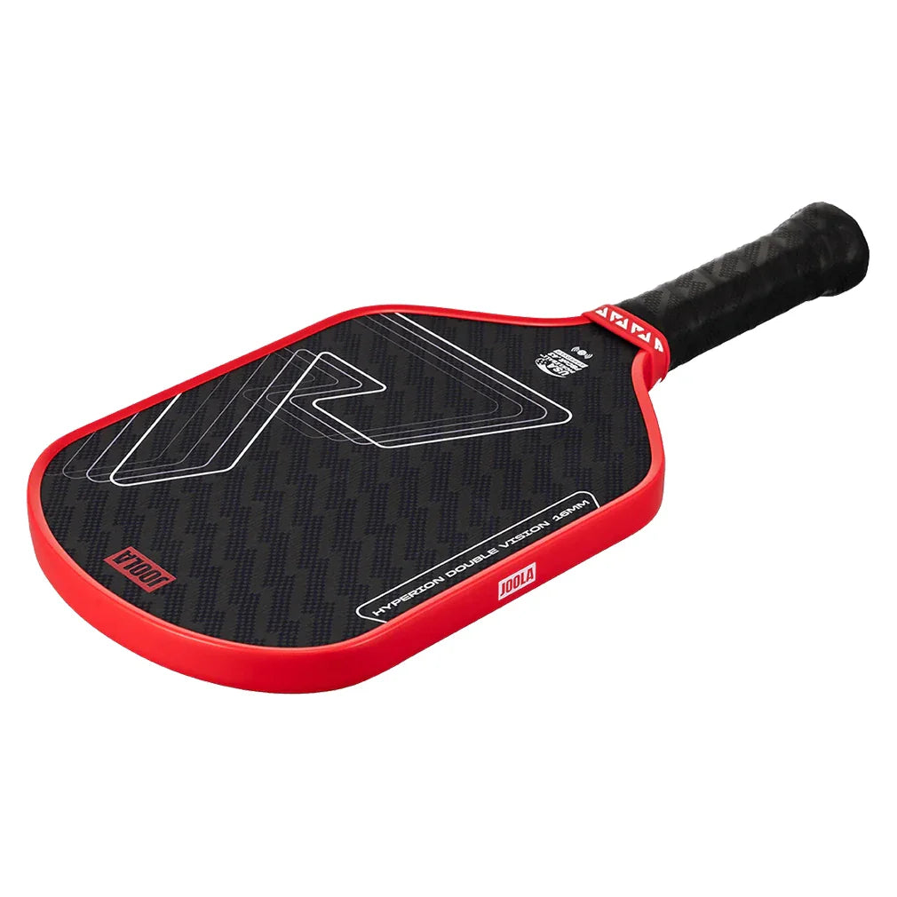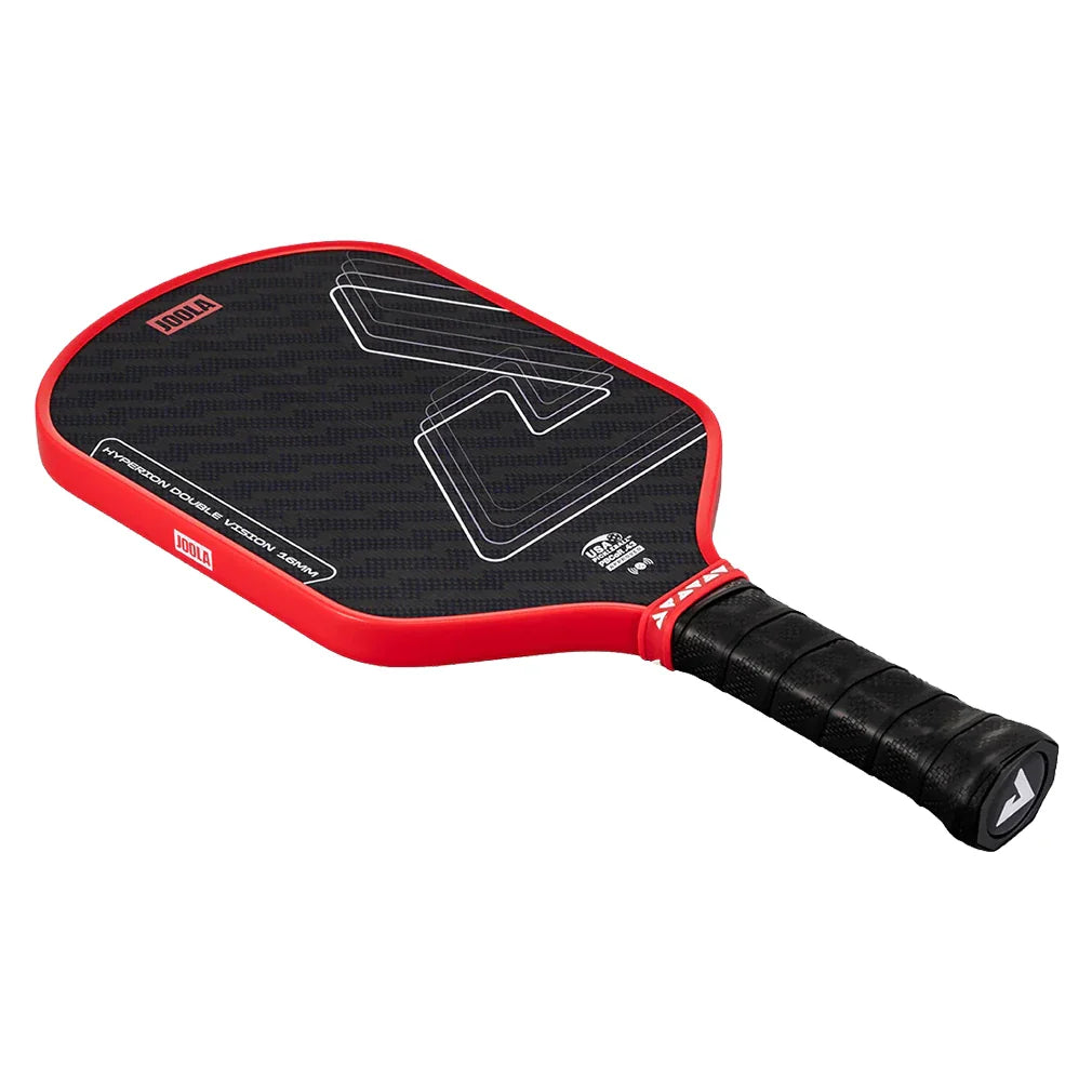 The Joola Hyperion Double Vision 16mm Pickleball Paddle is perfect for aggressive hitters, with its elongated length and tapered edge allowing players to hit fast and hard. Its textured, aramid surface enables spin generation to make winning shots even trickier to handle. A thermoformed edge wall at the neck provides extra stability and flexibility, while a special layer of SK Film between the core and hitting surface improves the sweet spot for more generous control.