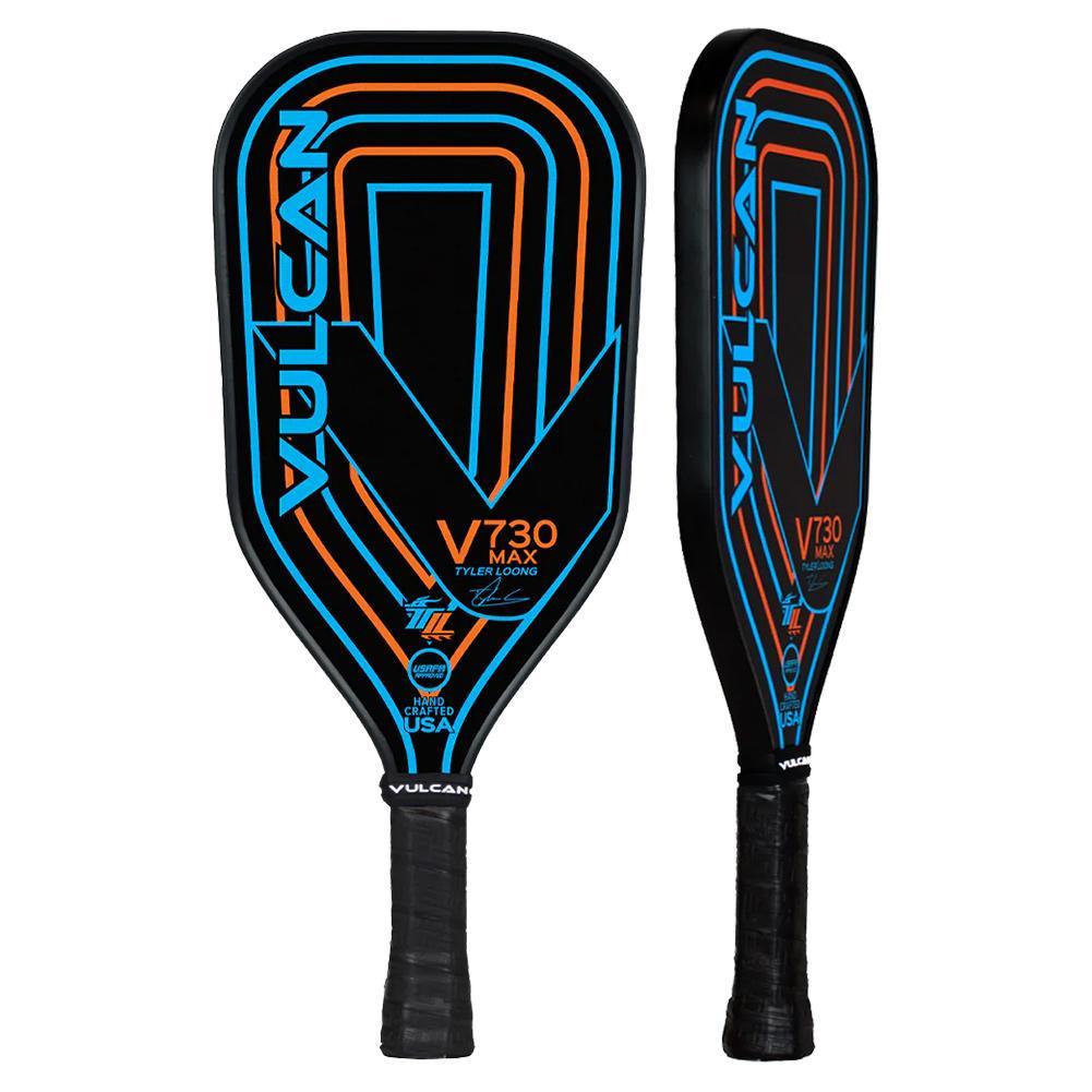 The Vulcan V730 MAX Pickleball Paddle LOONG maxes out power and feel with futuristic technology and they are made in the USA. It features Stateracore technology which consists of a 13mm polypropylene core with 8mm cells. Vulcan's V-Strut surfaces bands line the paddle face with 7 layers of TexTreme carbon fiber and fiberglass. The V-Skin surface bands create a large sweet spot and enhance the feel at contact. This paddle is assembled without the need for the usual adhesives thanks to Thermal Diffusion Welding. The Dura-Flex throat design strengthens the handle and and maximizes torsion and flex. The V730 has an elongated paddle shape and at a middle weight of 8.0 ounces, it offers a nice blend of mobility and power.