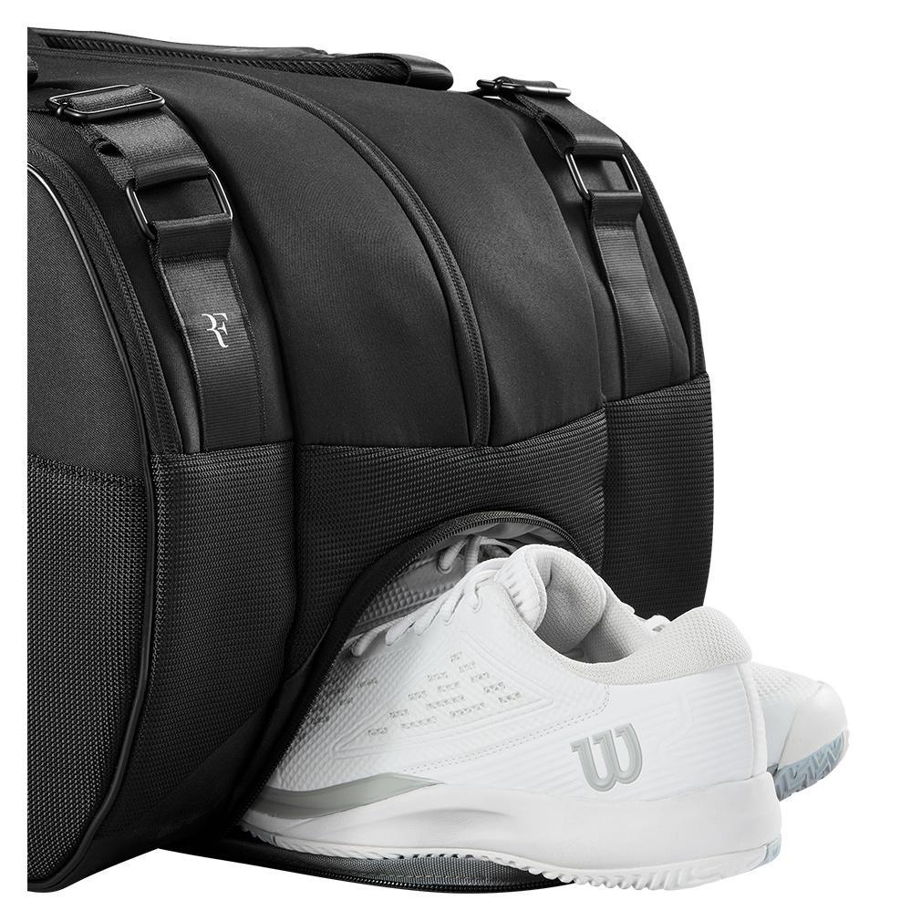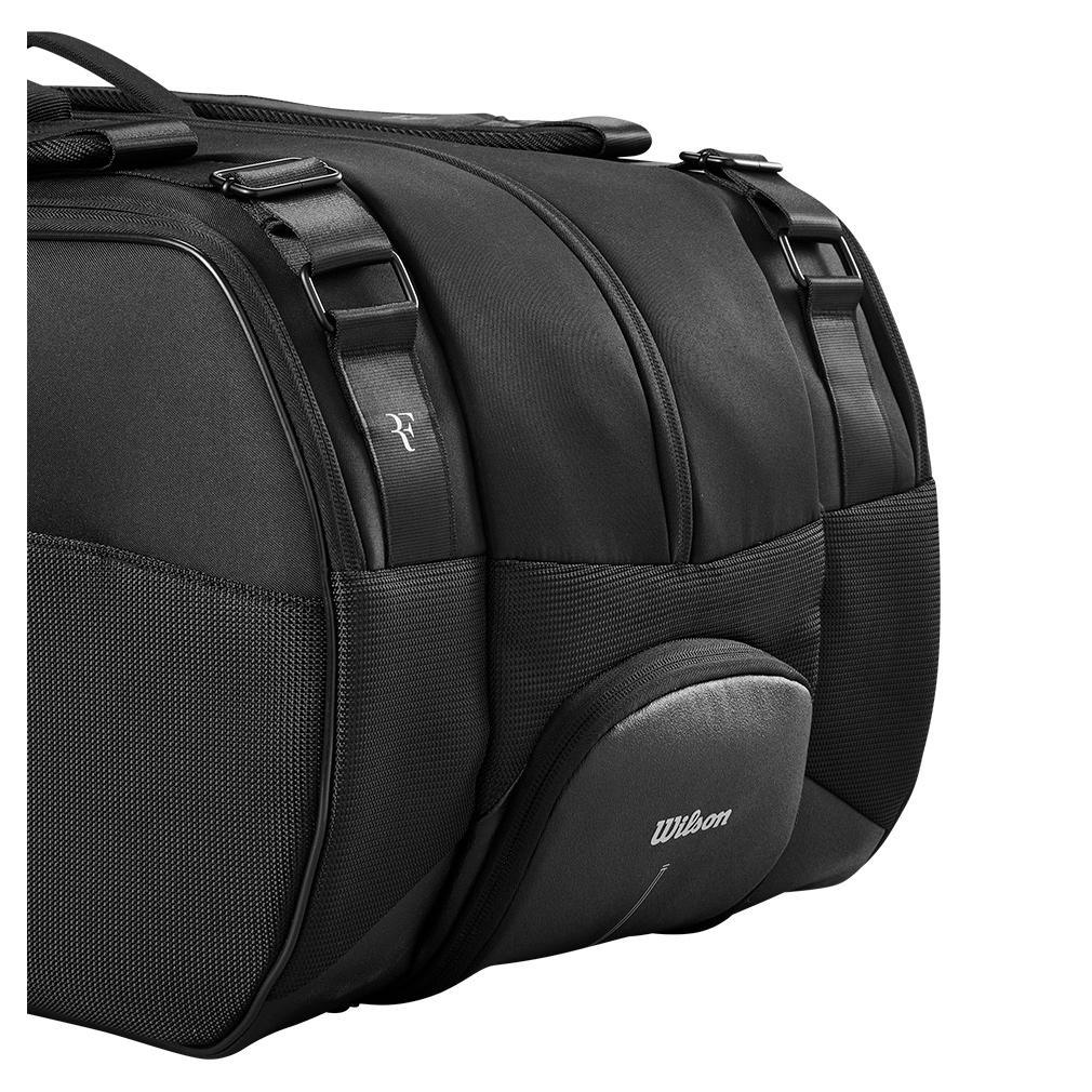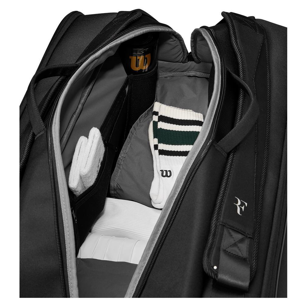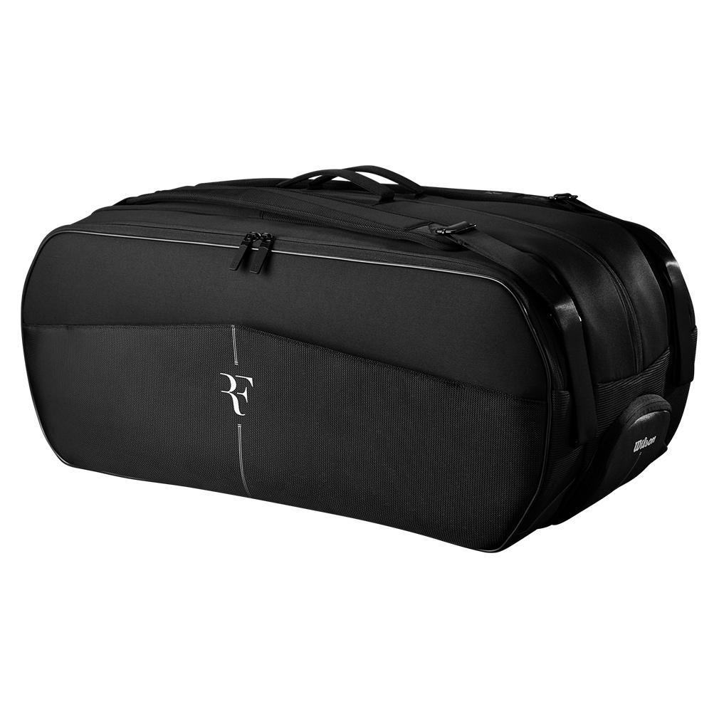 The Wilson RF Tournament 15pk Tennis Racquet Bag was inspired, designed, and tested by Roger Federer. Three main compartments can hold up to 15 racquets. Two of the main compartments feature Thermoguard lining to protect gear from extreme temperatures. Two easy-to-access side accessory pockets work wonders for smaller items, and an external shoe compartment keeps tennis shoes separate from racquets and other gear. The bag's interior features a premium lining which helps keep gear in good condition. The RF Tournament 15pk is a stylish and capable tennis bag for serious tournament players.