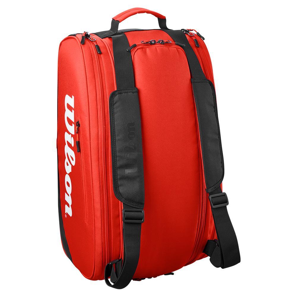 The Wilson Tour Red Padel Bag Red has an excellent carryall for your Padel gear. Two main compartments can hold up to six racquets and an interior pocket is perfectly designed for a laptop or tablet. The fleece-lined accessory pocket is perfect for small valuables, and a handy shoe compartment keeps dirty shoes away from the rest of your gear. One of the main compartments is protected by Wilson's Thermoguard technology so your racquets are shielded from extreme temperatures.