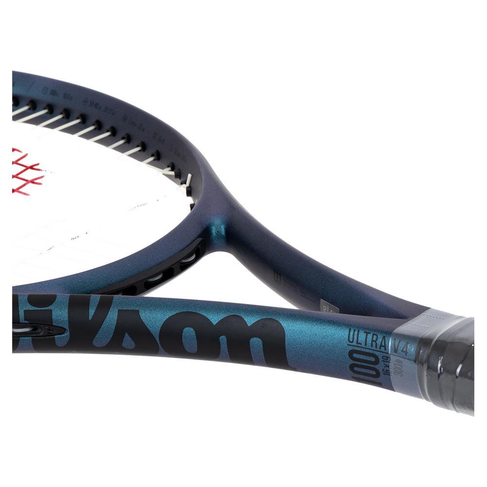The Wilson Ultra 100 v4 Demo Tennis Racquet reinvigorates the Ultra series with a simplistic new style and plenty of performance upgrades. V4.0 is built with a new frame geometry and thinner beam construction. FORTYFIVE° has been integrated into the lay-up for a softer, more comfortable feel along with enhanced stability. An expanded Sweet Spot Channel at the tip of the hoop adds extra power with less bulk for a sleeker, more aerodynamic look. V4.0 features the Crush Zone grommet system which compresses at impact to boost power and dwell time on strings. Lastly the racquet is finished with a clean-matte color shifting blue that alters its shade depending on the light.