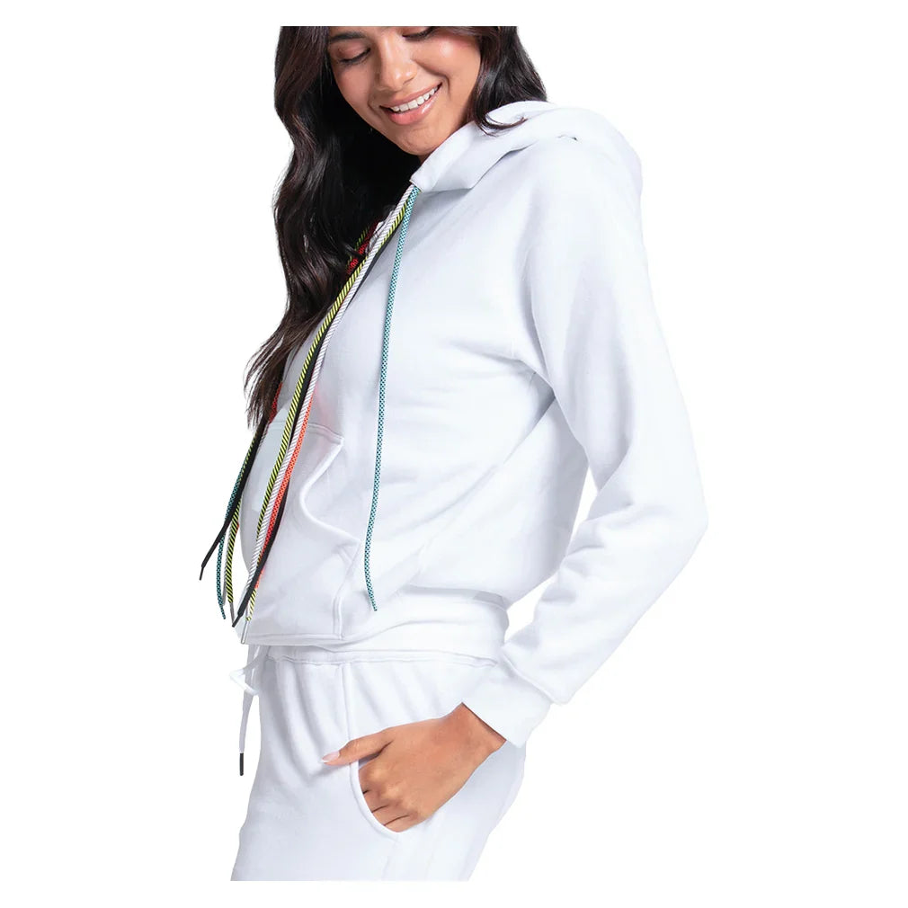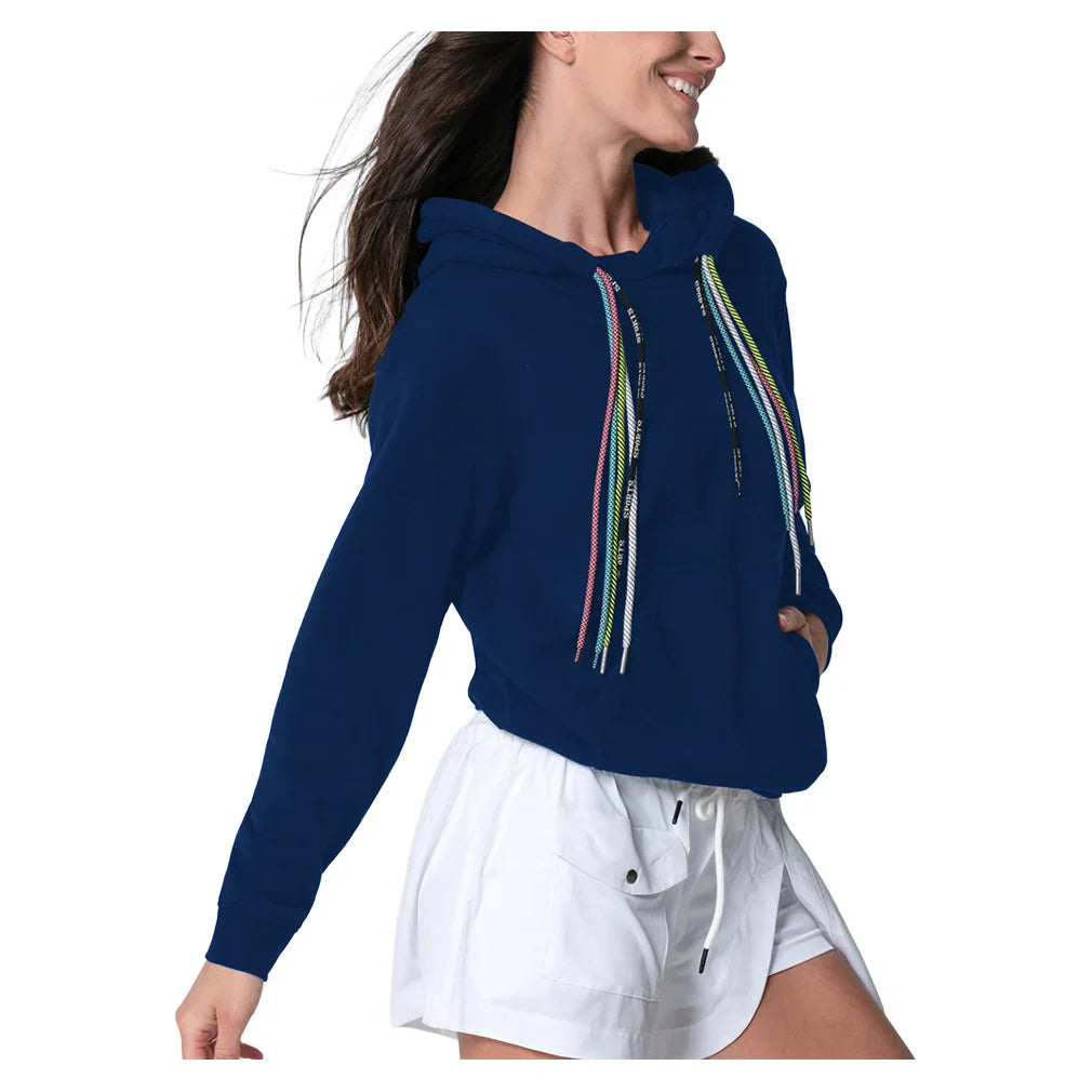 The Lucky in Love Women's Chroma Cord Tennis Hoodie adds vibrant style to your court wardrobe. This pull-over hoodie features multicolored drawstrings at the hood for an eye-catching detail. A front kangaroo pocket provides convenient storage for small essentials and hand warmth between sets. The relaxed fit offers comfortable layering for pre-match warm-ups or post-practice cool-downs.
