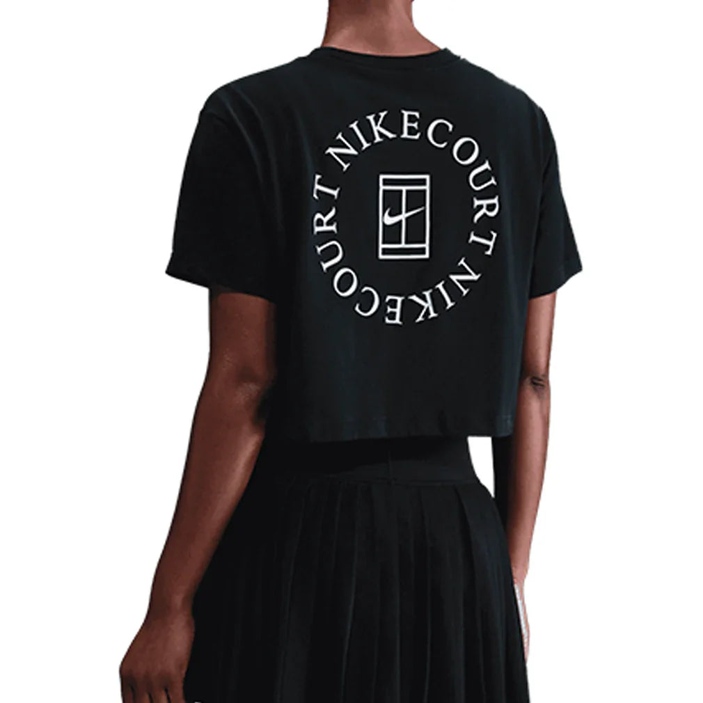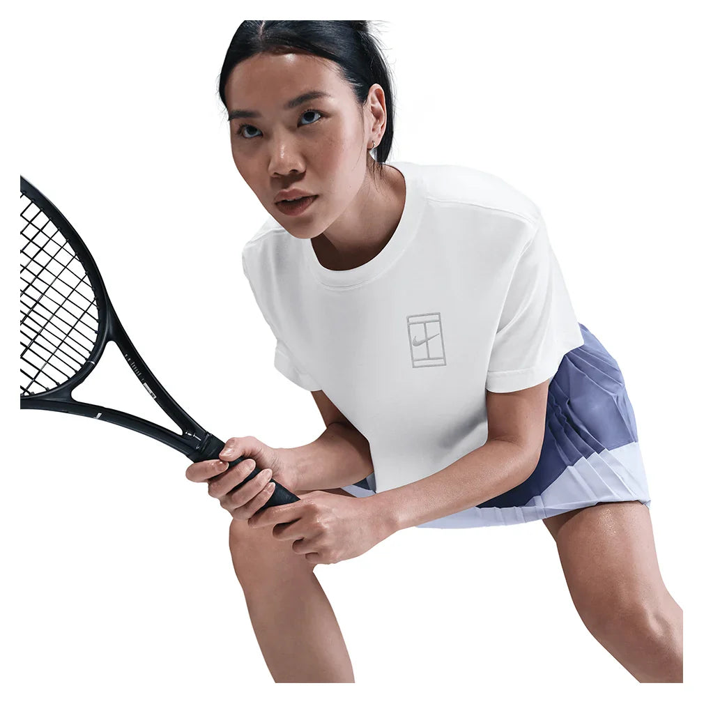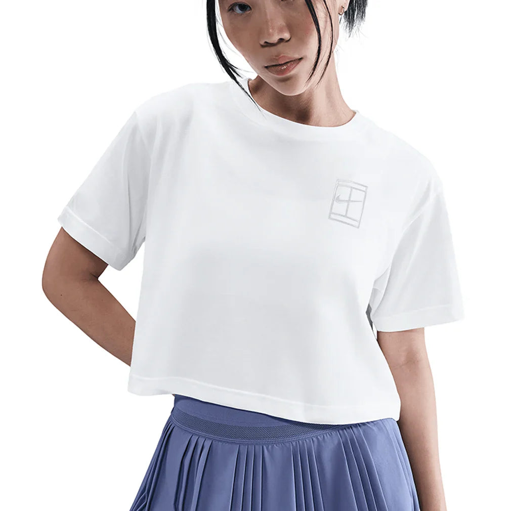 The Nike Women's Court Dri-FIT Slam Short Sleeve Cropped Tennis Tee features a relaxed fit that provides comfortable coverage without restricting movement during play. A classic crew neck and short sleeves create a timeless silhouette, while the cropped style adds modern appeal and pairs perfectly with high-waisted tennis bottoms. Dri-FIT technology wicks moisture away to keep you dry and comfortable through intense matches. A Nike Court graphic in the back adds authentic athletic style to this versatile piece. The relaxed fit and cropped length make this tee ideal for players who want contemporary comfort with reliable performance, perfect for practice sessions or layering over sports bras for a trendy court look.