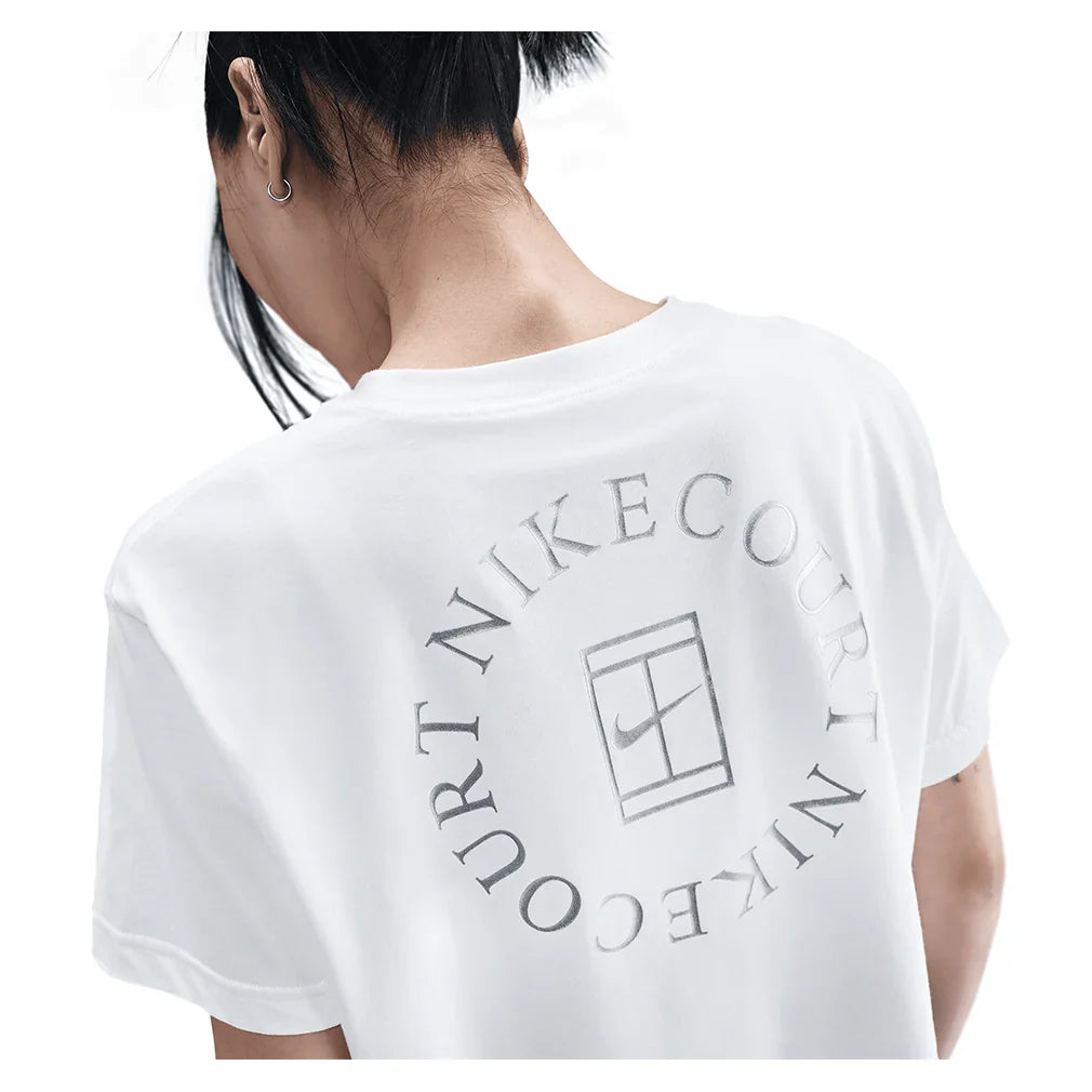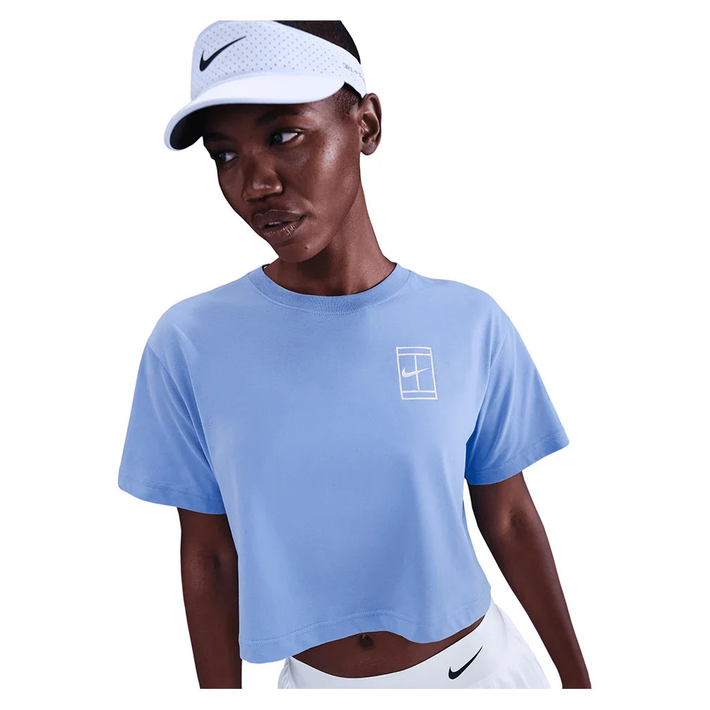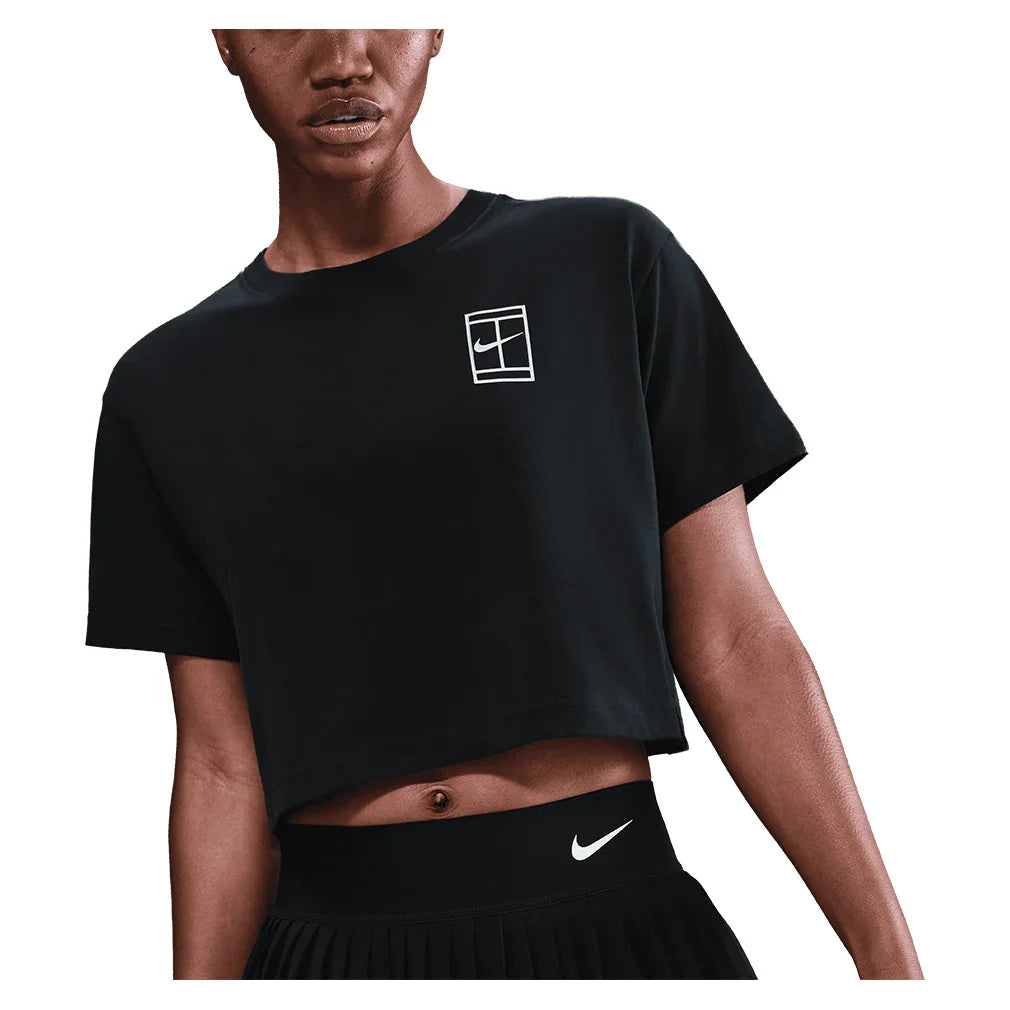 The Nike Women's Court Dri-FIT Slam Short Sleeve Cropped Tennis Tee features a relaxed fit that provides comfortable coverage without restricting movement during play. A classic crew neck and short sleeves create a timeless silhouette, while the cropped style adds modern appeal and pairs perfectly with high-waisted tennis bottoms. Dri-FIT technology wicks moisture away to keep you dry and comfortable through intense matches. A Nike Court graphic in the back adds authentic athletic style to this versatile piece. The relaxed fit and cropped length make this tee ideal for players who want contemporary comfort with reliable performance, perfect for practice sessions or layering over sports bras for a trendy court look.