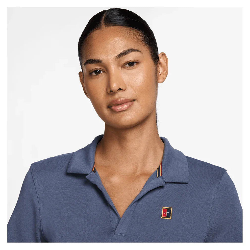 The Nike Women's Court Heritage Short-Sleeve Cropped Tennis Polo updates classic court style with a cotton-spandex blend that moves naturally through serves and groundstrokes while maintaining its shape point after point. The slightly cropped length pairs perfectly with high-waisted tennis skirts or shorts, eliminating excess fabric that can bunch during play. A body-skimming fit reduces drag without feeling restrictive, allowing full rotation through your swing, while the V-neck placket provides adjustable ventilation to regulate temperature during intense rallies. The soft cotton construction absorbs moisture and feels gentle against skin during long matches, with just enough spandex for recovery and stretch. Machine washable for easy care between matches, this polo features a NikeCourt patch on the left chest that signals your commitment to tennis tradition with a fresh, modern silhouette.