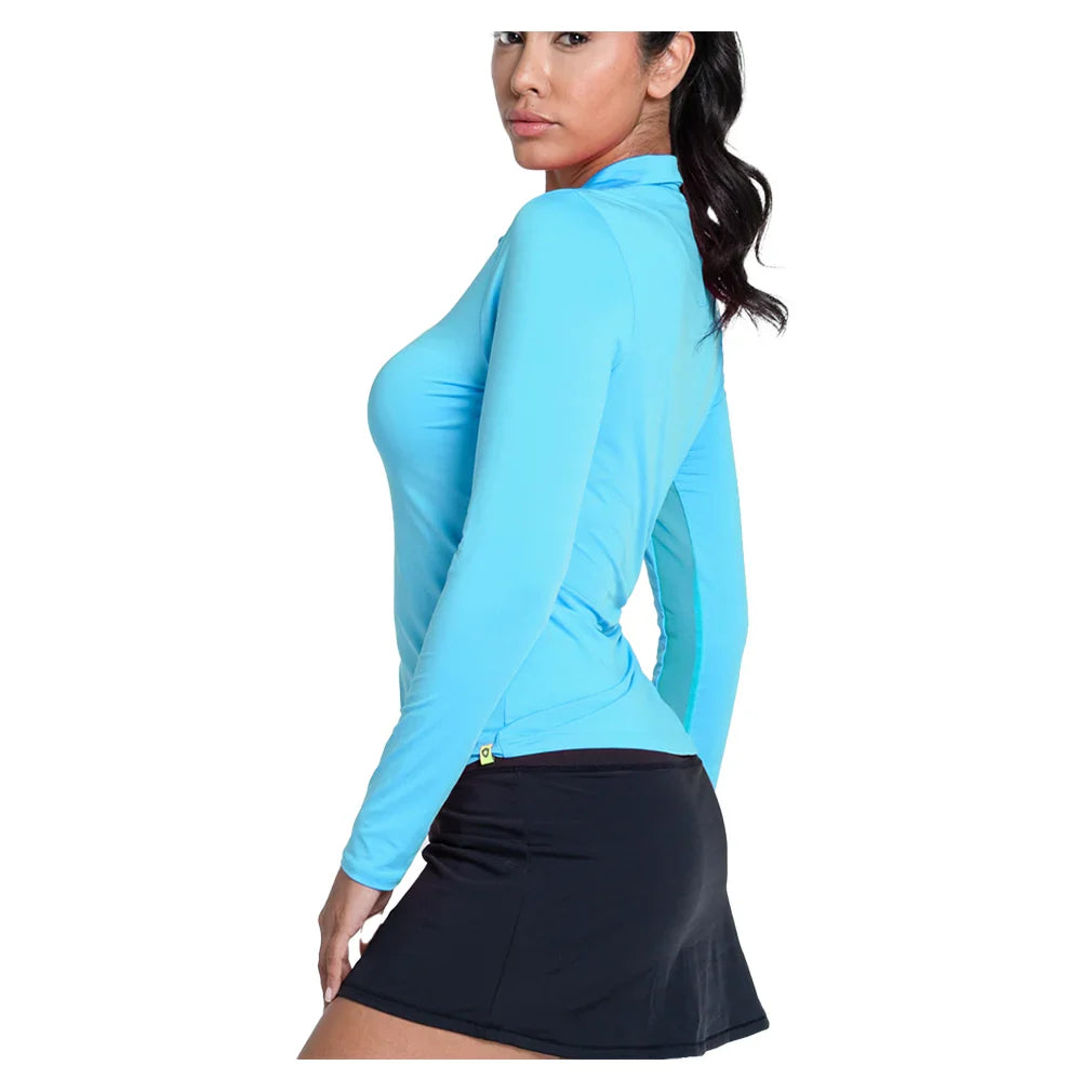 Freedom to move, protection to perform. The Lucky In Love Women's Free Play Zip Long Sleeve Tennis Top Parrot blends performance and style with its semi-fitted design and lightweight jersey fabric. Made from 88% polyester and 12% Lycra, it offers four-way stretch for ultimate mobility, while the zip-up neckline allows for adjustable coverage. With an SPF 50 rating, this top provides sun protection, keeping you safe during long matches or outdoor training sessions. Designed for comfort and durability, it’s machine washable and perfect for layering or wearing on its own. Stay covered, stay confident, and stay in the game.
