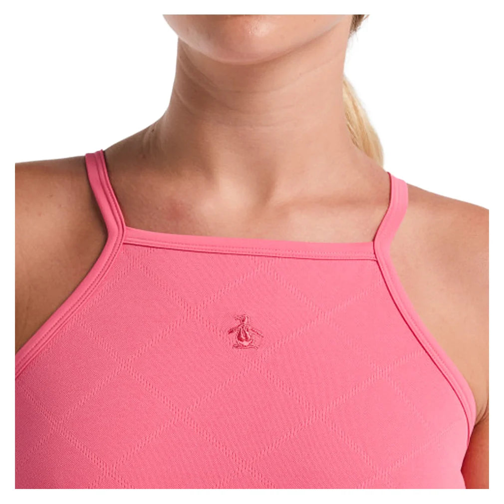 The Penguin Women's Grid Jacquard Tennis Tank with Shelf Bra combines support and style with a subtle diamond jacquard pattern. This tank features spaghetti straps for minimal tan lines and maximum shoulder freedom during serves. A built-in shelf bra with removable pads provides light support without the need for additional layers. Moisture-wicking fabric made partially from recycled polyester helps regulate temperature during intense play. Finished with a tonal embroidered logo at the center chest.