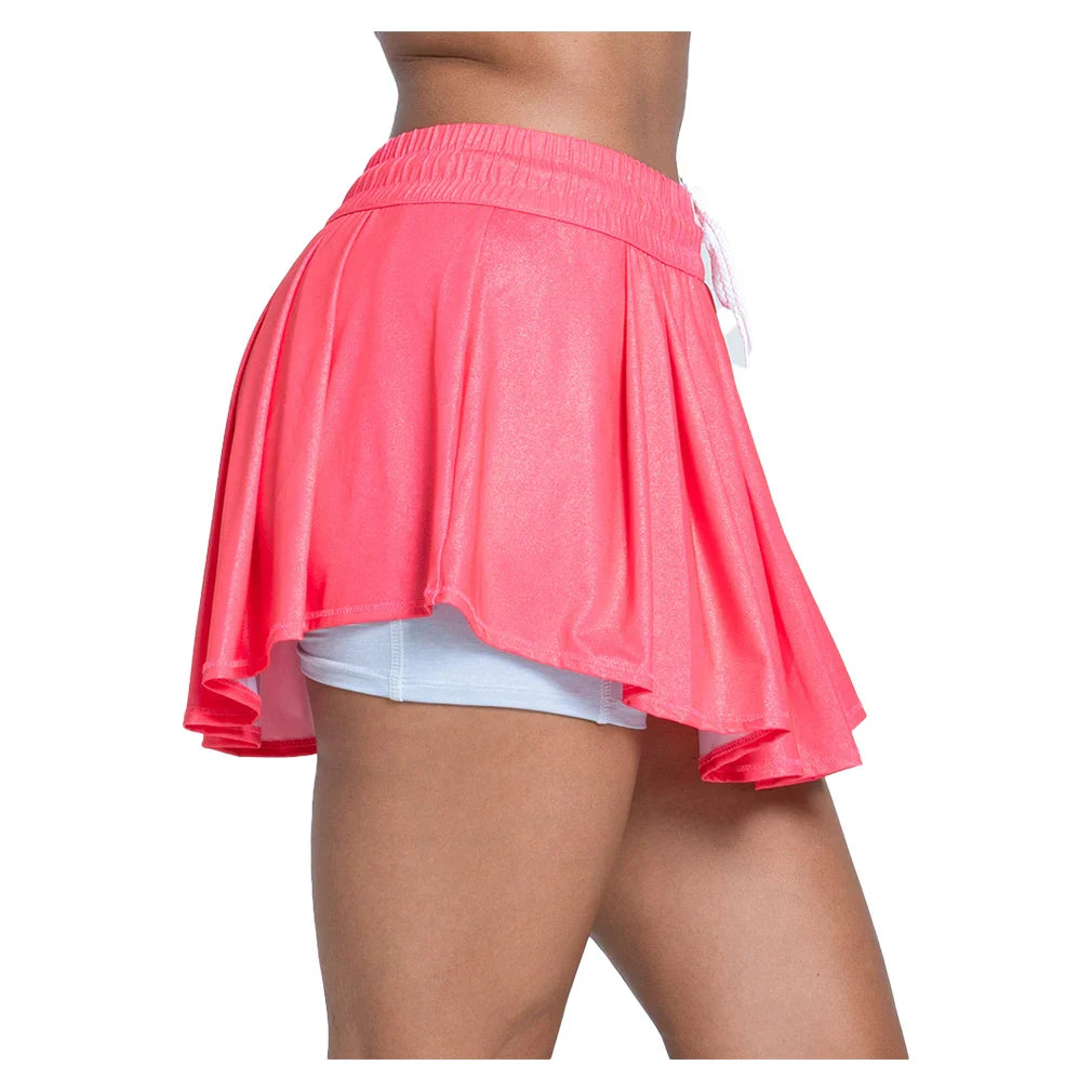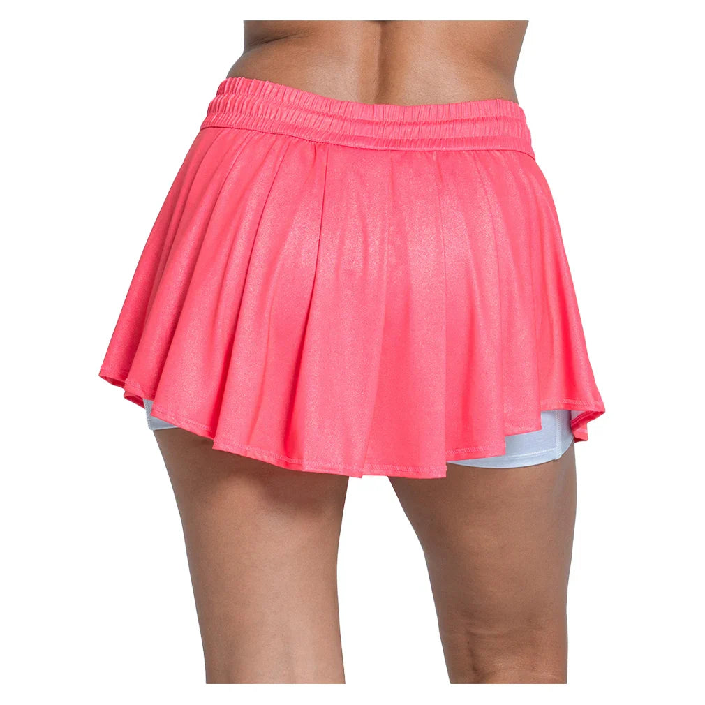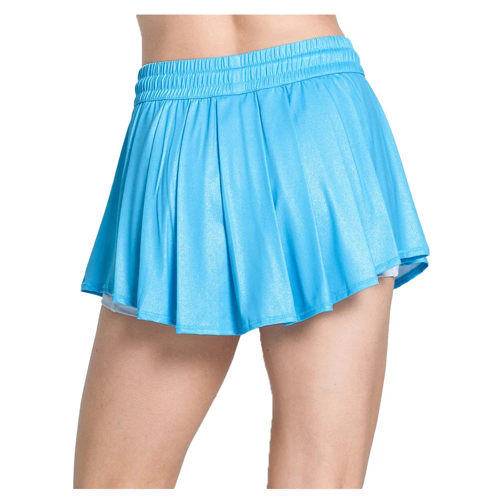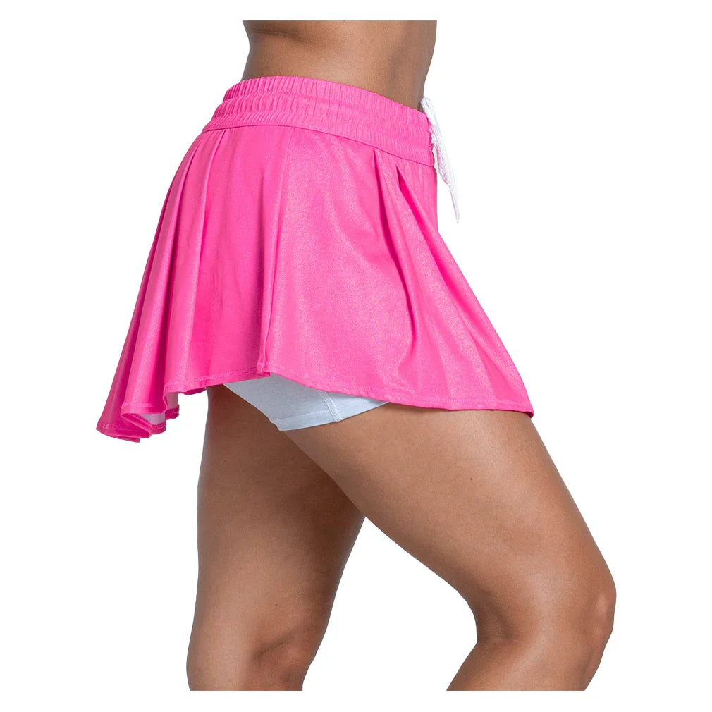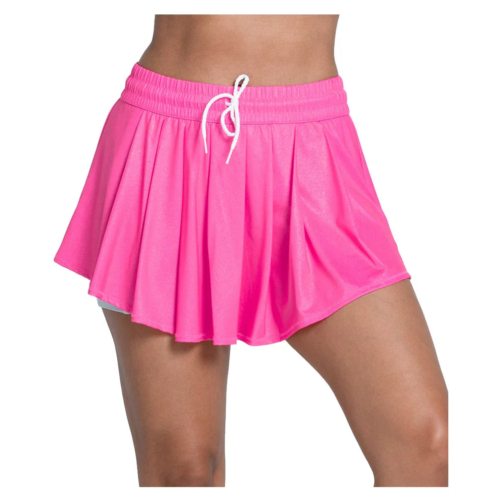 Add some shimmer to your wardrobe with the Lucky in Love Women's High Waist All That Shimmers 13.5 Inch Tennis Skort. Featuring built-in shorts for comfort and visible through it's chic design, this skort offers a perfect blend of functionality and fashion. The front drawstring tie allows for a personalized fit, while the unique pattern adds a vibrant touch to your on-court look. Achieve peak performance in style with this eye-catching skort.