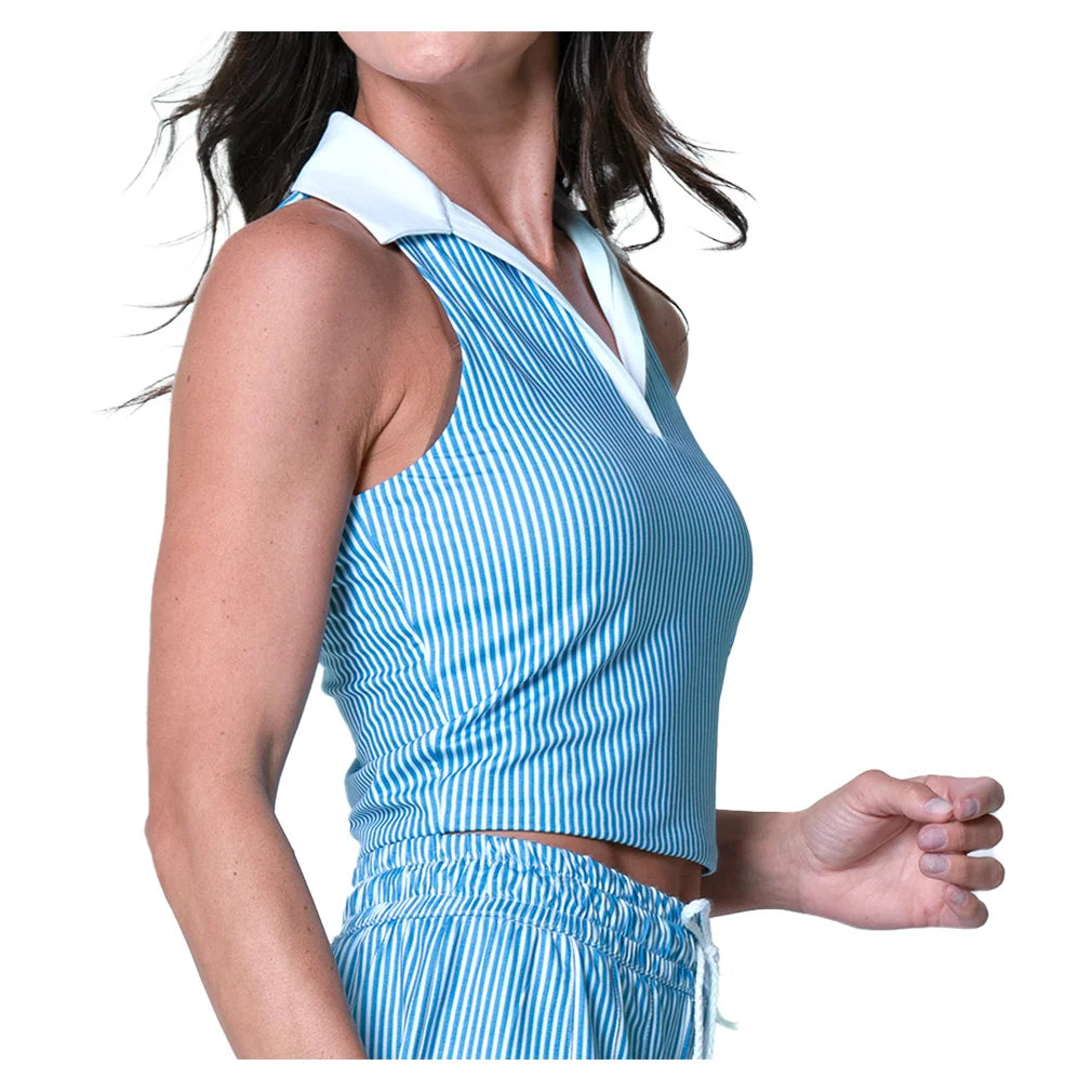 The Lucky in Love Women's Hip Fit Linen Stripe Tennis Tank features a crop style that pairs perfectly with high-waisted tennis bottoms for contemporary court fashion. A V-neck with classic collar detailing creates a polished look that balances sporty and sophisticated elements. The full-back, sleeveless design provides complete coverage while allowing unrestricted arm movement for every shot. Linen stripe fabric adds textural interest and breathability for comfortable wear during play. This tank combines modern proportions with timeless tennis styling, ideal for players who appreciate refined details and current silhouettes. The hip-length crop and quality construction make this a versatile piece that transitions seamlessly from practice to post-match activities.