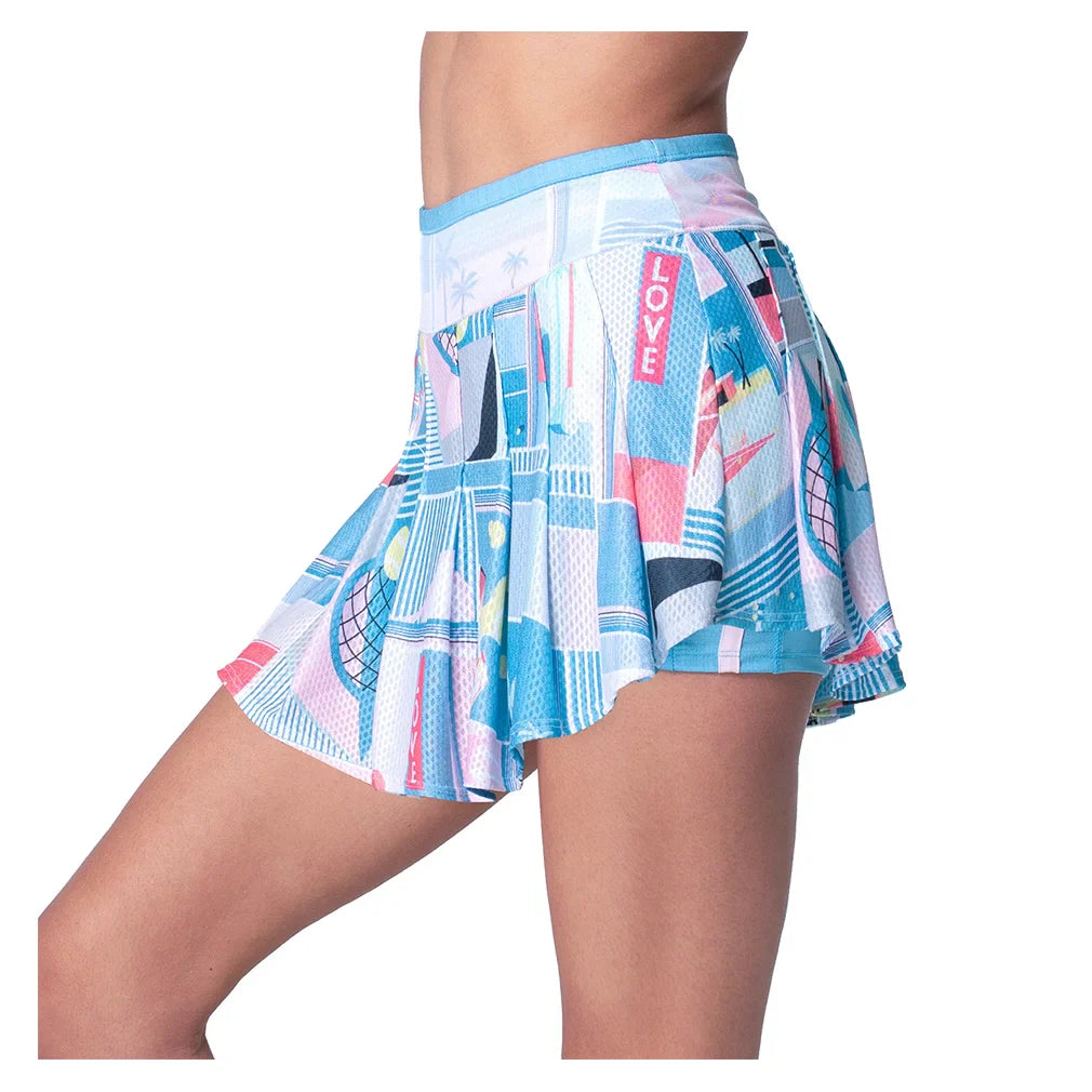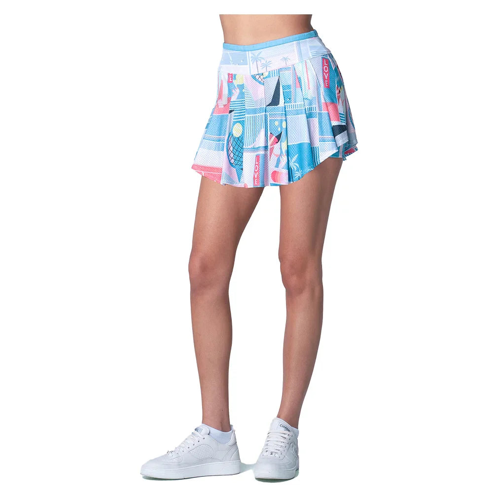 A classic look with a modern twist, the Lucky in Love Women's Shibori Plaid 14.5 Inch Tennis Skort White and Royal. This timeless white skort is elevated with blue shibori plaid details, bringing a unique and eye-catching design to the court. Crafted from high-quality fabrics, it offers breathability, comfort, and durability for intense play. The 13.5-inch length and built-in shorts provide stability and coverage, while the wide waistband and flattering skirt shape add a touch of flair and individuality. Whether you're competing or training, this skort ensures you move with confidence and style.