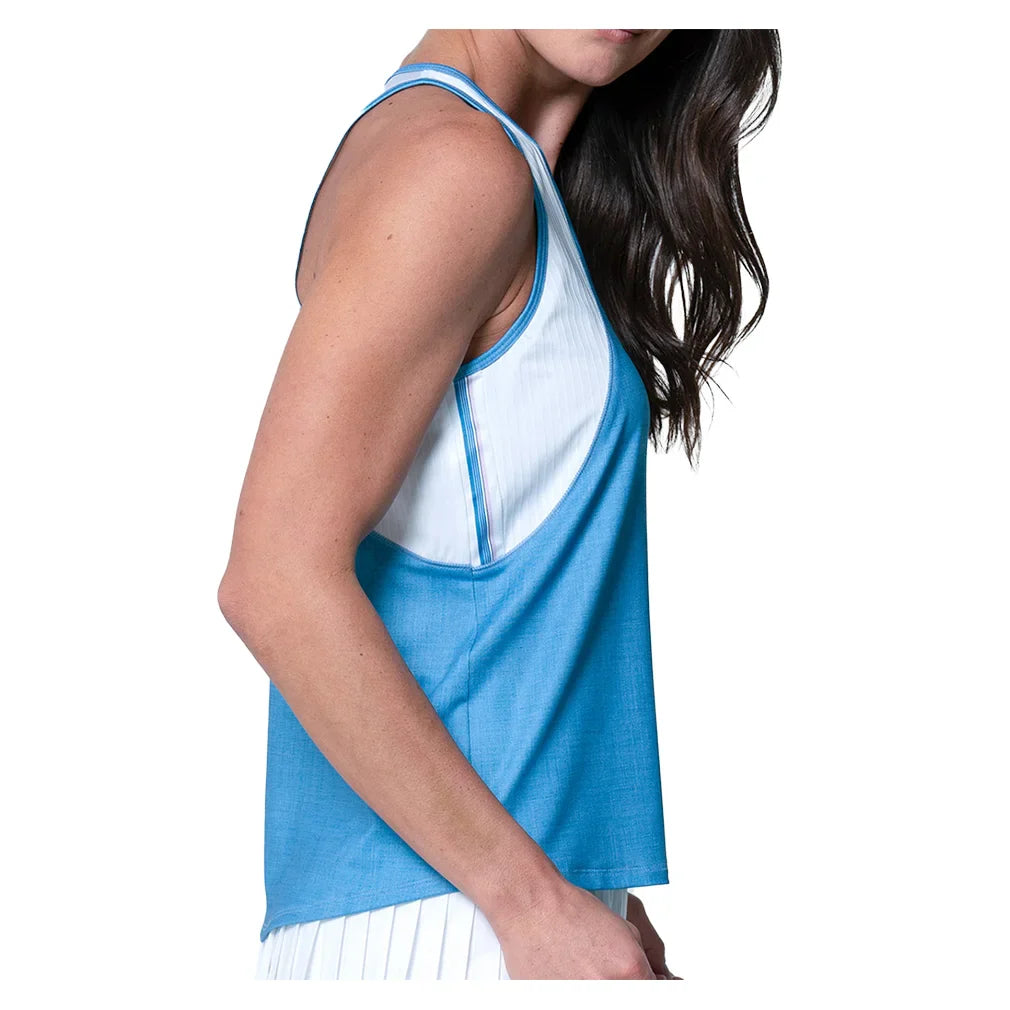 The Lucky in Love Women's Linen Play Tennis Tank features a high neckline for refined coverage paired with strategic mesh panels along the underarms and back that provide targeted ventilation during intense play. A high-low hemline offers extra coverage in back while creating a modern silhouette that moves beautifully on court. Breathable linen-blend fabric works with the mesh inserts to keep you cool and comfortable through demanding matches. This tank combines practical performance features with contemporary design elements, perfect for players who appreciate both functionality and style. The thoughtful placement of mesh panels and the flattering hemline make this a versatile piece that performs as well as it looks during competitive play.