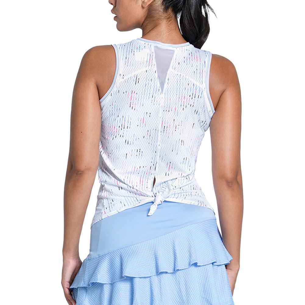 Easy on the eyes and even easier to play in, the Lucky In Love Women's Love Me Blue Tie Back Tennis Tank White. offers a fresh, contemporary look. Wear it open or tie it in the back for added style, while the modern ombre floral pinstripes and classic stripes at the neckline and armholes provide a chic touch. Crafted from waffle fabric with a semi-fitted silhouette, this tank ensures both comfort and mobility. Notched armhole details further enhance freedom of movement, so you can glide across the court in confidence and style.