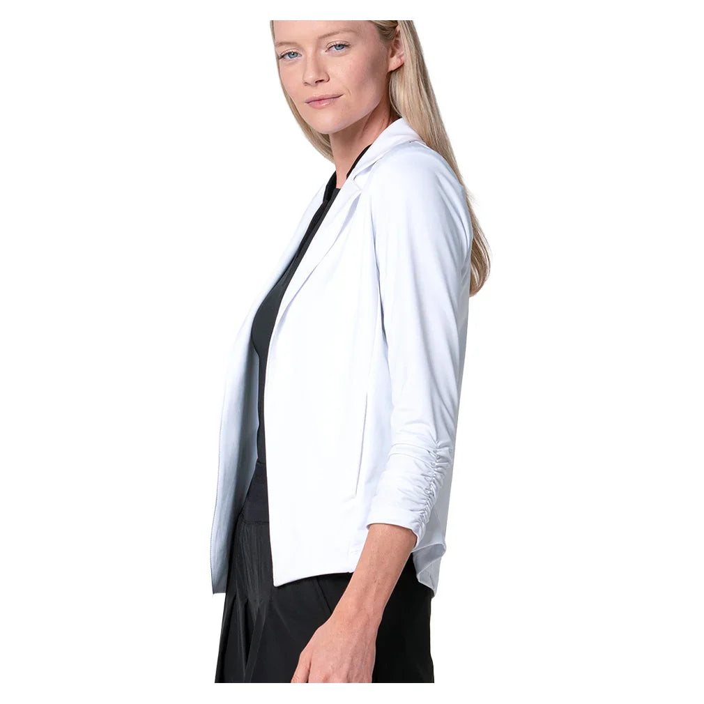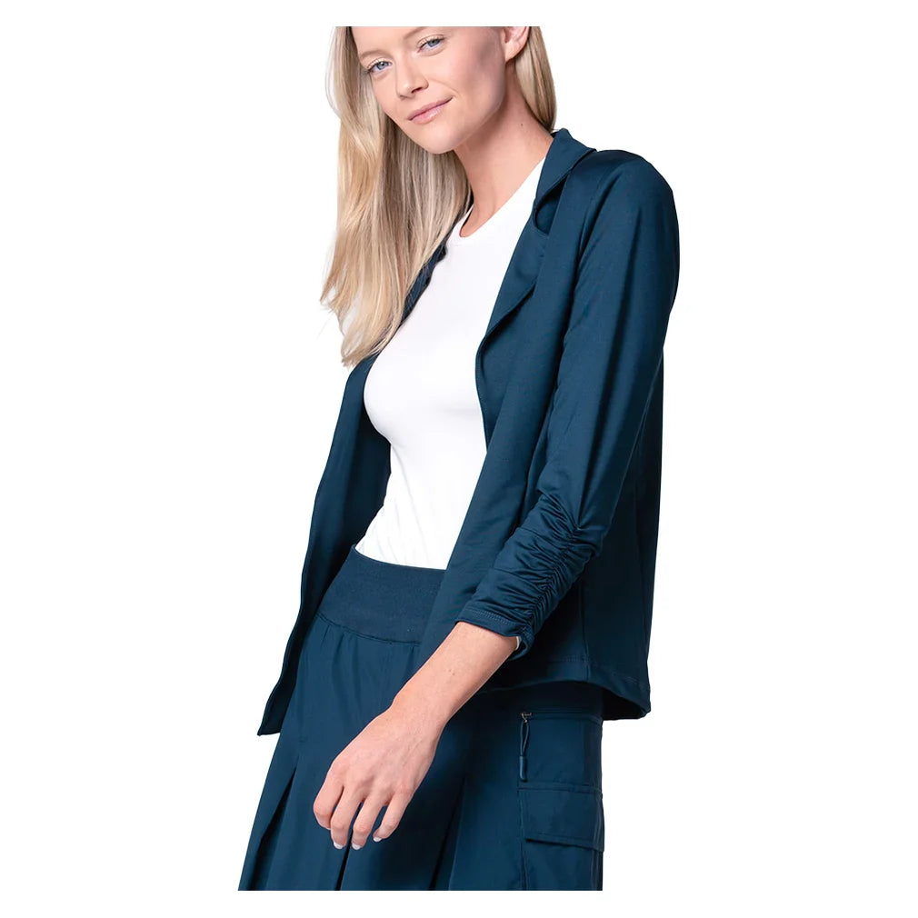 The Lucky in Love Women's Lucky Court Blazer adds polished style to your tennis wardrobe. This blazer features an open front design for easy layering over your favorite court attire. Ruched detailing at the cuffs creates a feminine touch while adding visual interest to the sleeves. The tailored collar provides a classic, professional look that transitions seamlessly from court to clubhouse. This versatile piece works perfectly as a warm-up layer or for post-match occasions.