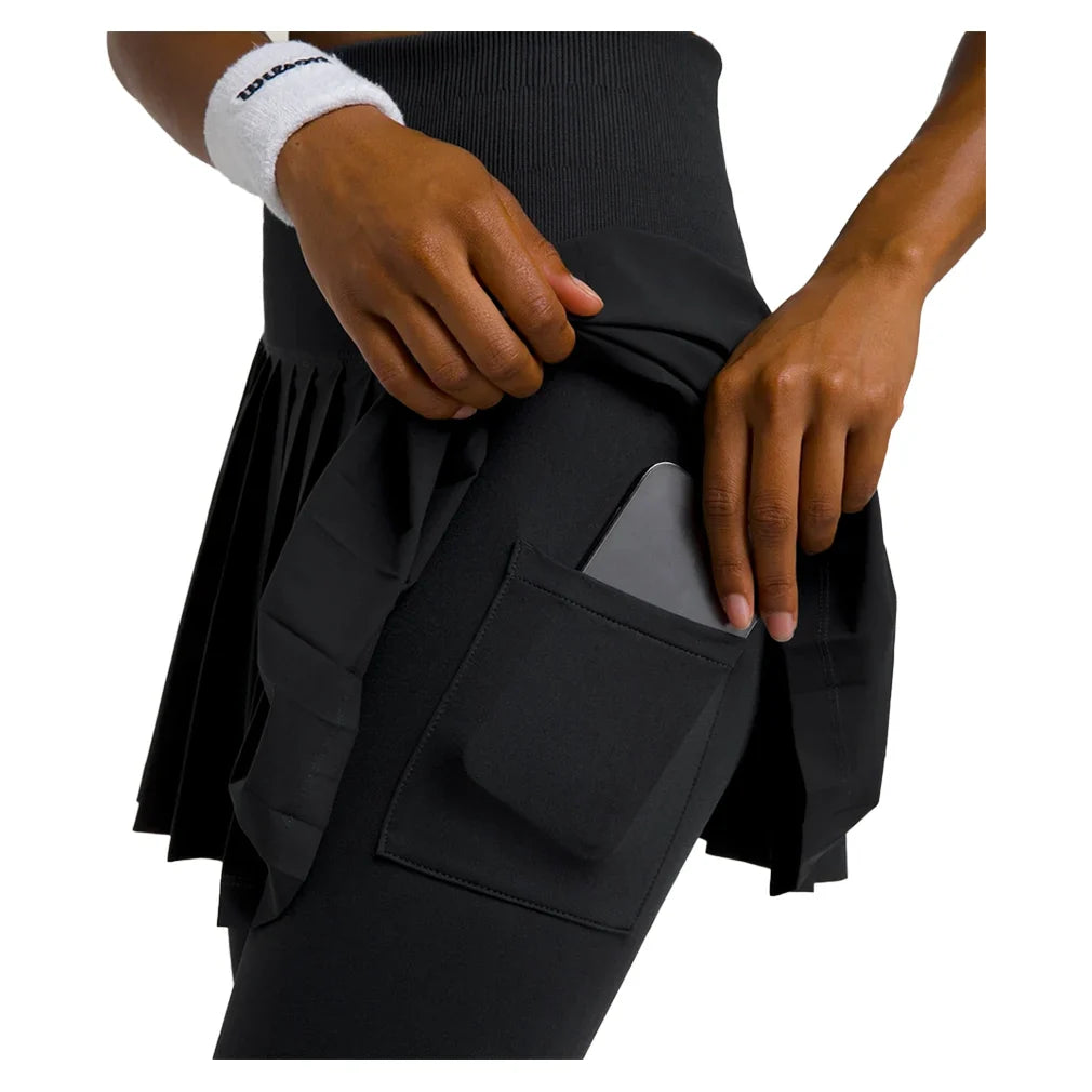 The Wilson Women's Midtown Skirty Tennis Tight Black is a full-length take on the classic pleated tennis skirt, designed to keep you comfortable and performance-ready in cooler temperatures. Featuring a multi-modulus waistband, it provides graduated support and a secure fit without restricting movement. The ultra-lightweight knit fabric ensures breathability and ease of motion, while seamless technology minimizes waste and enhances comfort. Quick-drying properties keep you feeling fresh, and the media pocket on the left leg offers convenient storage for small essentials. With a 7/8 length that hits just above the ankle, this sleek and functional piece is the perfect blend of fashion and performance for the changing seasons.