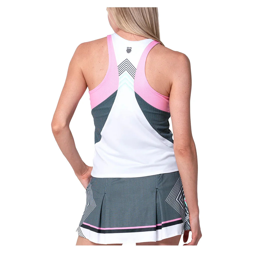 The K-Swiss Women's Motion Tennis Tank Techno is built for athletes who play as hard as they look good doing it. Bold geometric patterns amplify your on-court presence while all-performance fabric delivers maximum mobility and moisture-wicking power through every baseline battle. When the match heats up, this tank keeps you cool, dry, and ready to dominate the next point.