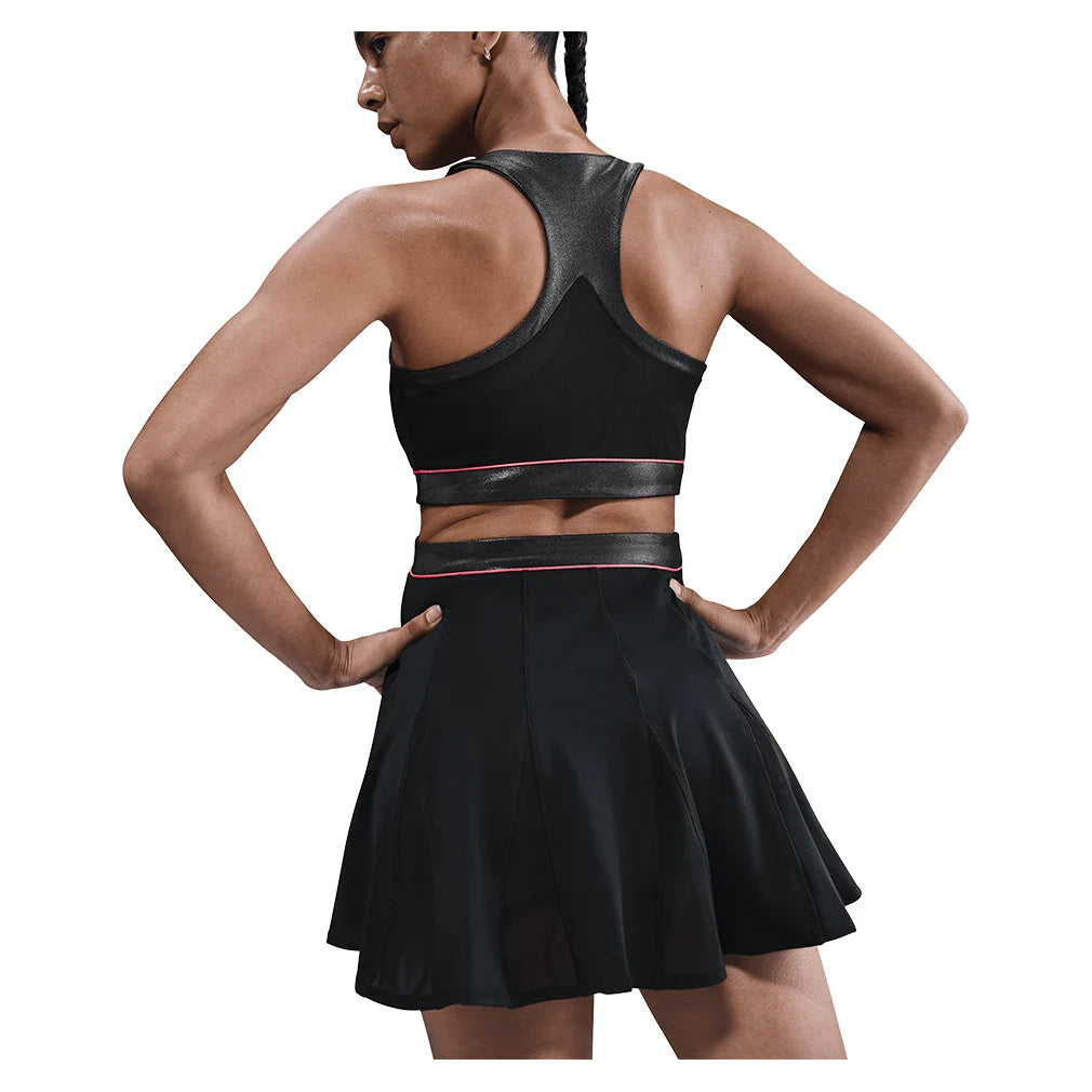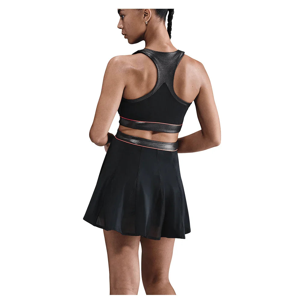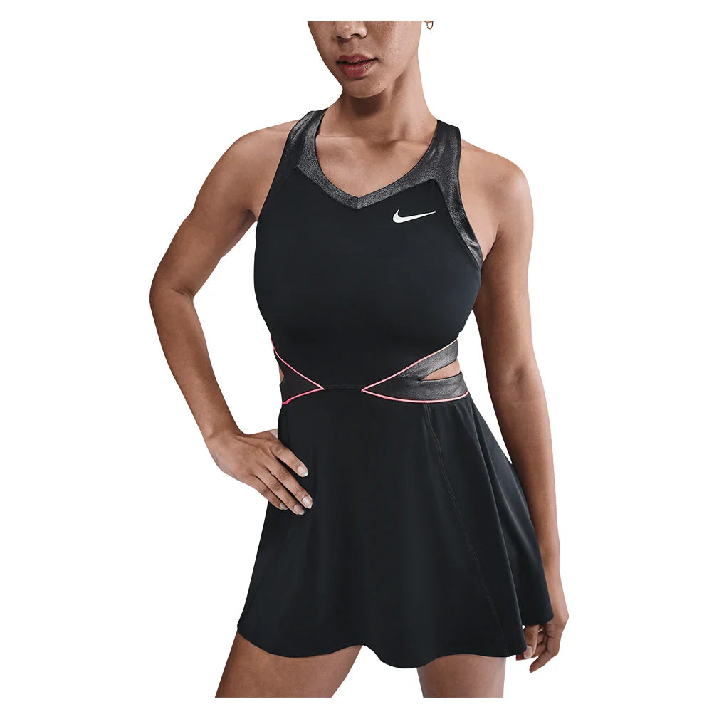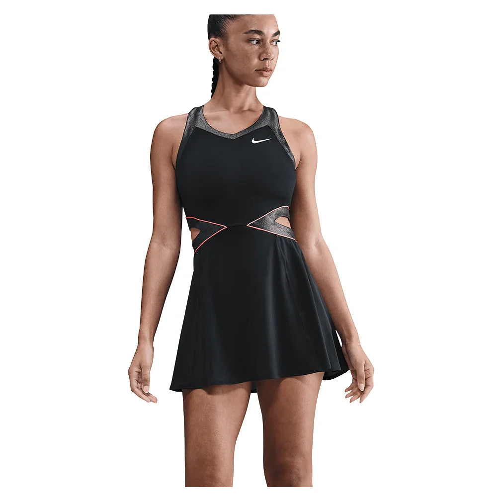 The Nike Women's New York Court Dri-FIT Slam Tennis Dress features a racerback design that provides unrestricted arm movement for powerful serves and overheads. A flattering V-neck creates a classic silhouette, while a wrap-around cutout in the back adds contemporary flair and enhanced ventilation. The box pleat skirt delivers elegant movement and a full range of motion during play, maintaining coverage while allowing complete freedom for every shot. Dri-FIT technology efficiently manages moisture to keep you dry and focused through demanding matches. This dress combines athletic performance with runway-inspired design, perfect for players who demand both technical excellence and standout style on tennis's premier courts.