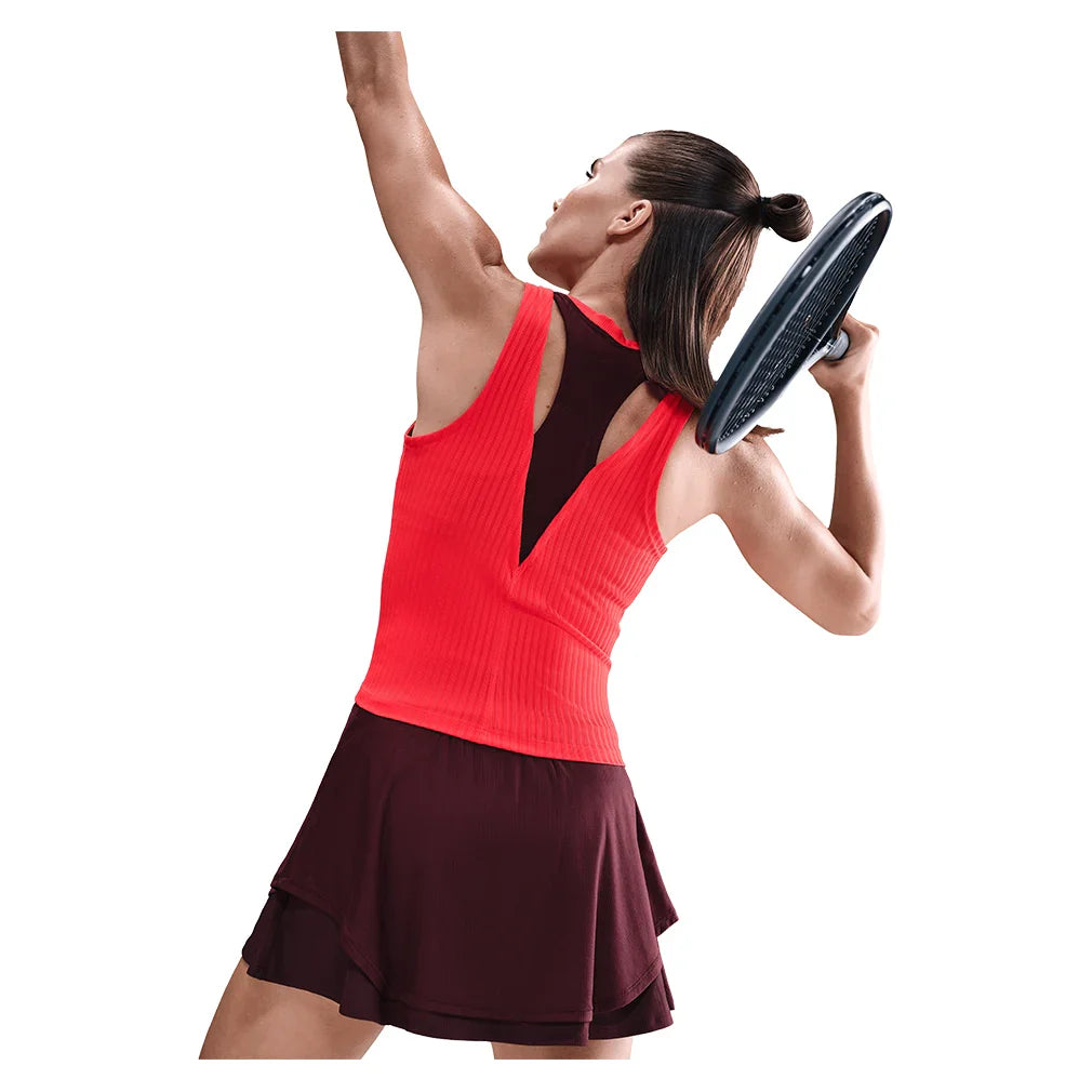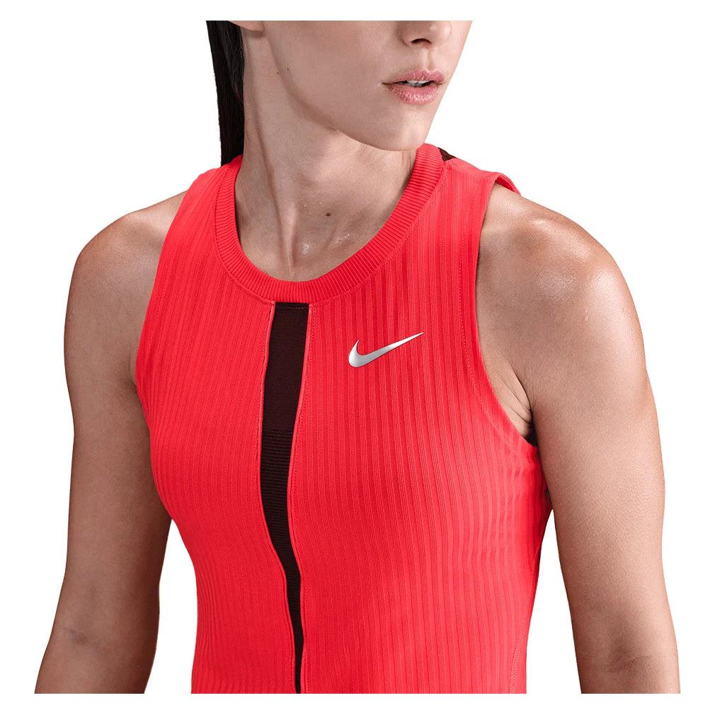 The Nike Women's New York Court Dri-FIT Slam Tennis Tank combines bold design elements with performance technology for standout court style. A high neckline in front contrasts with deep V detailing and strategic cutouts in the back, creating visual interest while providing enhanced ventilation. The racerback construction allows unrestricted arm movement for powerful shots, while the high-low hemline offers extra coverage in back with a modern silhouette. Dri-FIT technology keeps you dry and comfortable by wicking moisture away from your skin during intense play. This tank brings runway-inspired aesthetics to athletic performance, perfect for players who want to make a statement while competing at the highest level on tennis's premier stages.