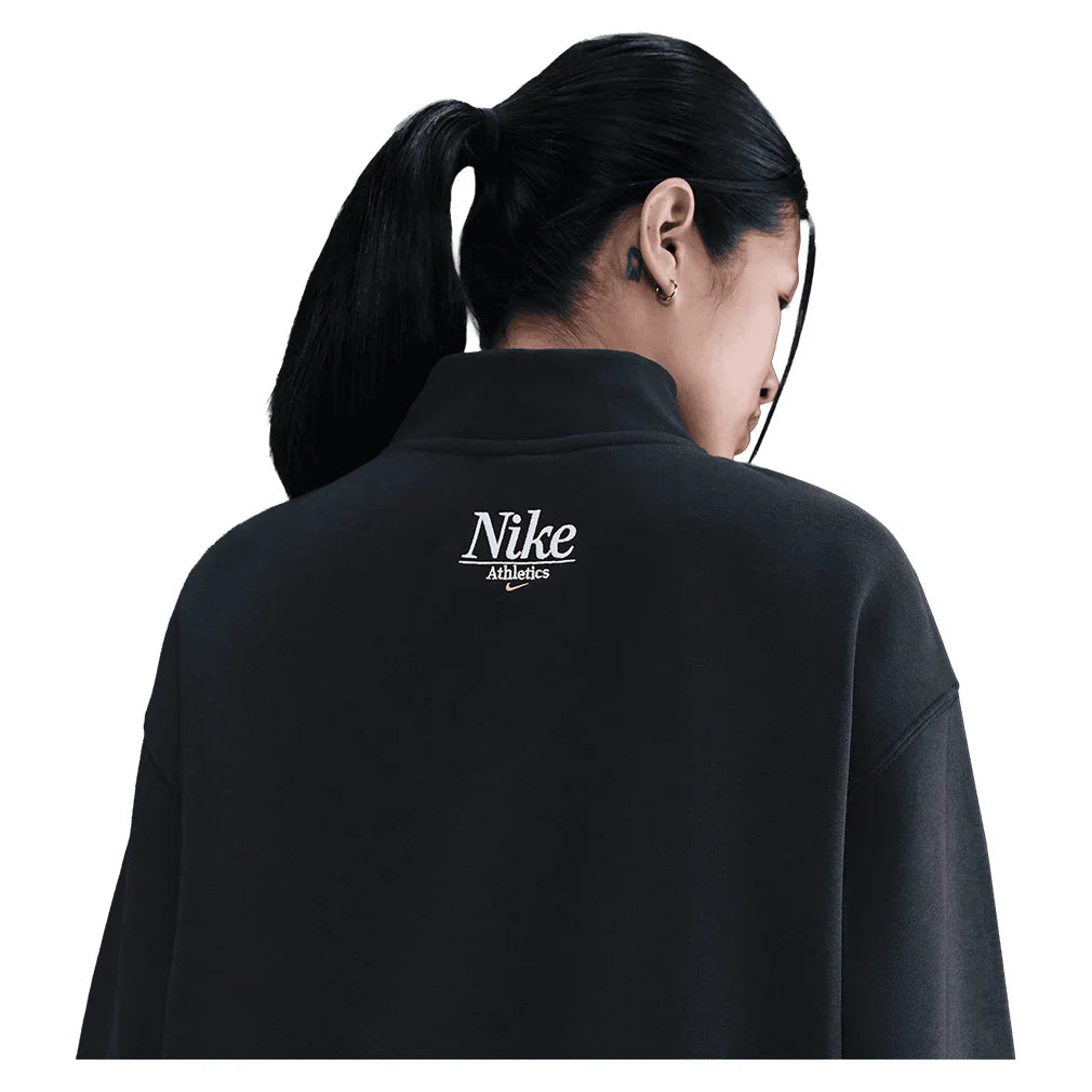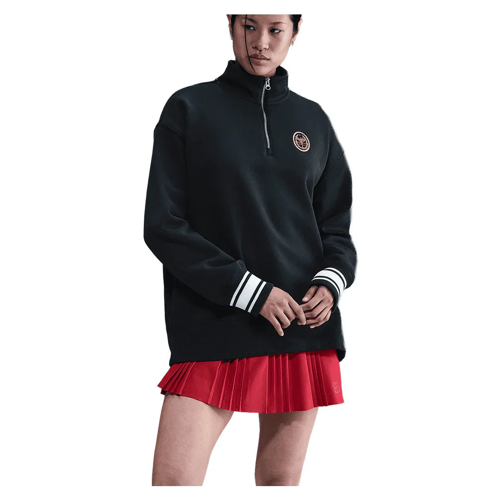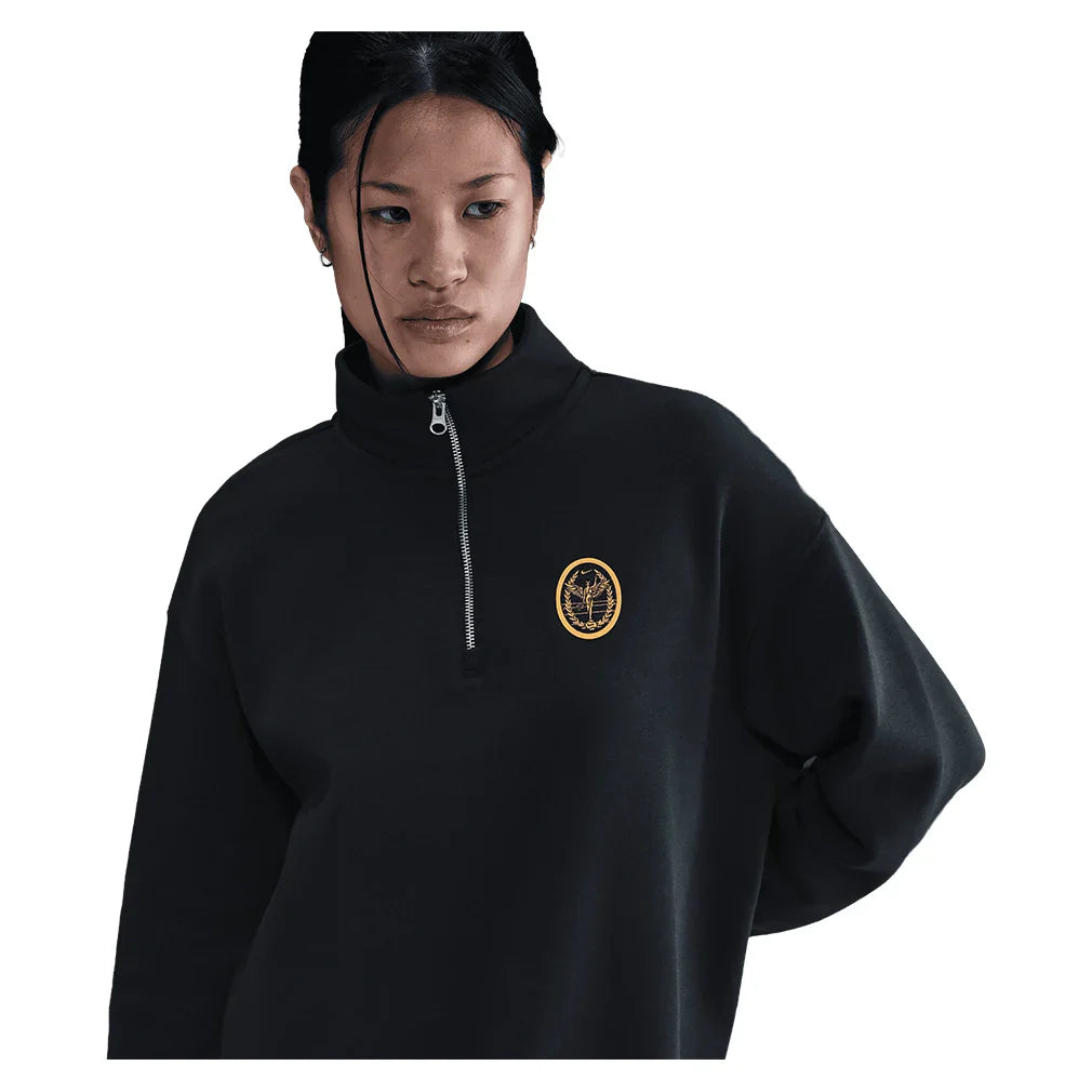 The Nike Women's Phoenix Fleece Quarter Zip Tennis Top delivers customizable warmth with its 1/4-zip design that lets you regulate temperature during chilly morning practices or between matches. Extra soft fleece interior provides cozy comfort against skin while the smooth exterior resists pilling and maintains a polished appearance, courtside. The oversized, extra-long silhouette with dropped shoulders allows complete freedom of movement for dynamic warm-ups and stretches, never restricting your reach or rotation. Extra-wide ribbing at the cuffs and hem adds structure while preventing the sleeves from sliding down during activity, keeping you focused on your game. The cotton-polyester blend balances warmth with breathability, preventing overheating as you transition from rest to play. Machine washable construction holds up to frequent use, making this versatile layer ideal for pre-dawn training sessions, cool evening matches, or comfortable recovery wear after intense practice.