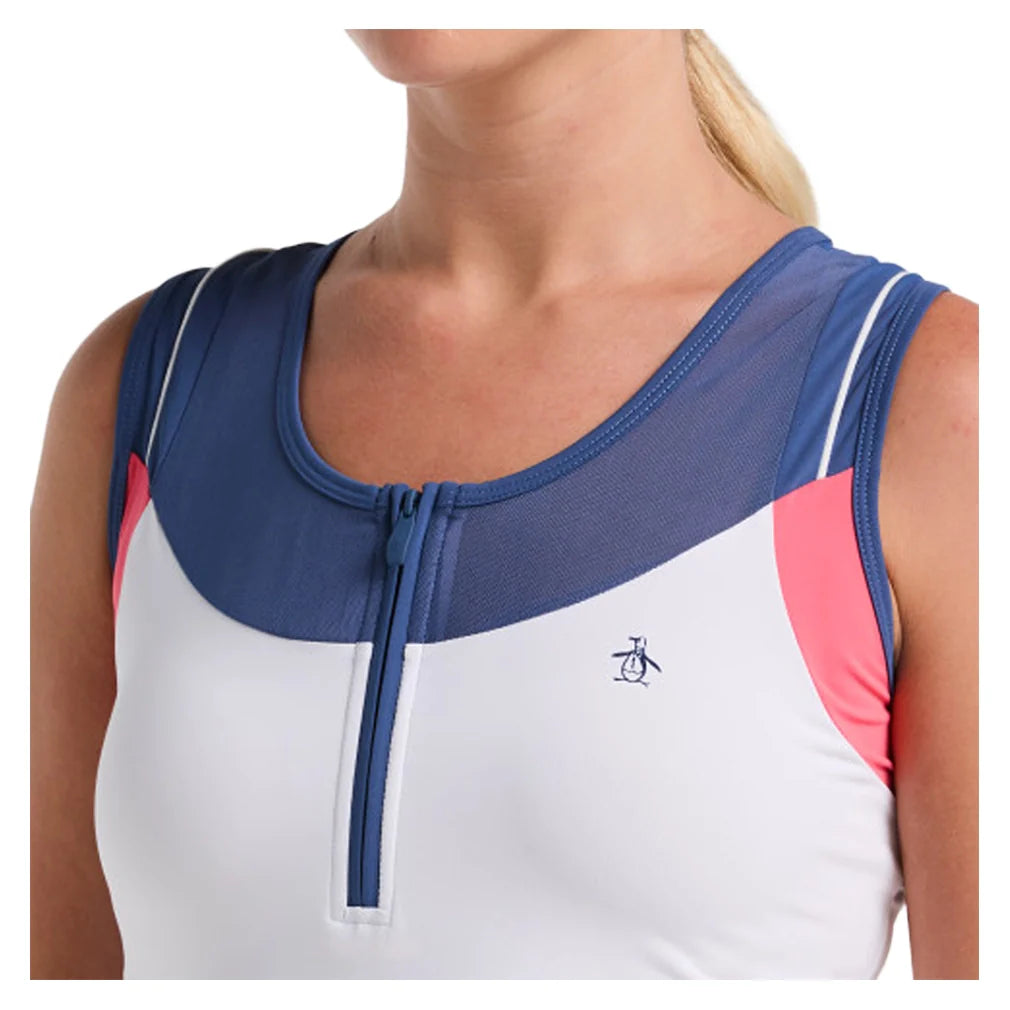 The Penguin Women's Color Block Tennis Tank brings sporty style to your court wardrobe. This performance tank features a modified racerback design that allows unrestricted shoulder movement. An adjustable front zipper provides customizable ventilation during play. A sheer mesh insert at the front neckline adds breathability and visual interest. The colorblock design creates a fresh, athletic look. Moisture-wicking fabric helps keep you dry from warm-up to match point. Finished with a Penguin logo at the left chest.