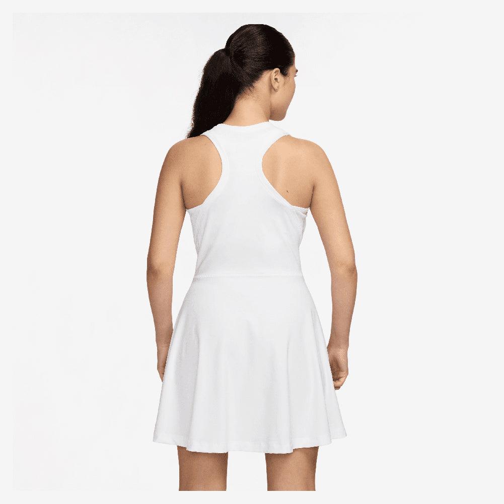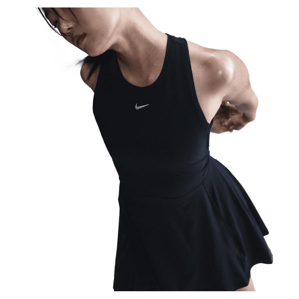 Get into the action with our Nike Women's Dri-Fit Victory Tennis Dress. This tennis dress has a classy mock neck collar paired with a sassy v-neck. Lightweight and incredibly soft it is made with extra stretchy fabric that will move with you while you play. It also is equipped with Dri-FIt technology that moves sweat away from the body so you can stay dry and focused during the competition. Plus, with its keyhole cutout in the back, you will have more breathability to keep you cool. Complete with pleats in the back that will flare and flow while you run.