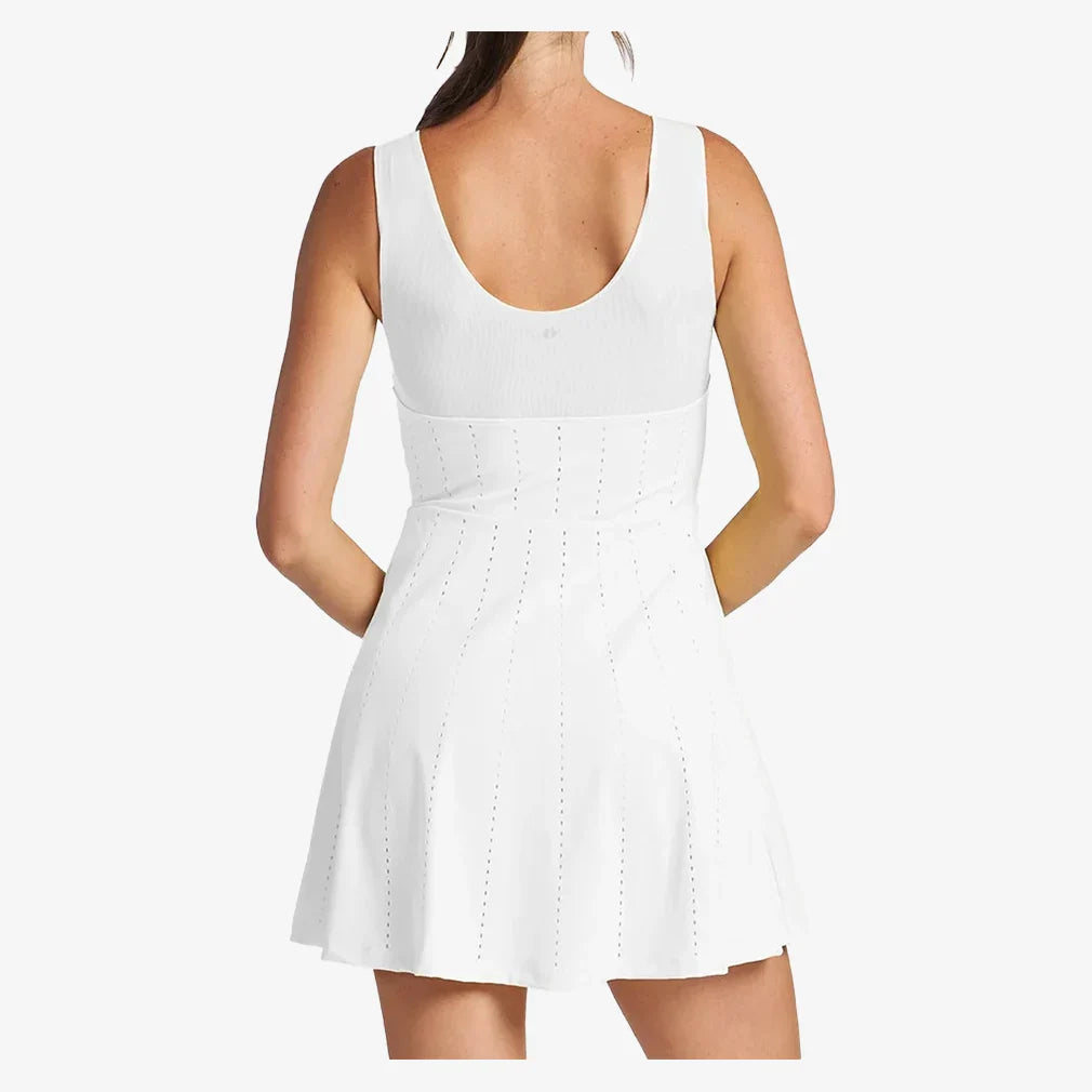 Serve up style and performance with the Thrive Societe Women’s Endure Perforated Zip Tennis Dress in White. Designed for both power and grace, this sleek dress features a breathable mesh front yoke and perforated detailing to keep you cool under pressure. The zippered front opening offers a customizable fit, while removable cups and an attached inner short with ball pockets ensure full coverage and convenience. Crafted from Endure Nylon Compression fabric, this dress moves effortlessly from the court to the street, making it a must-have for any active wardrobe.