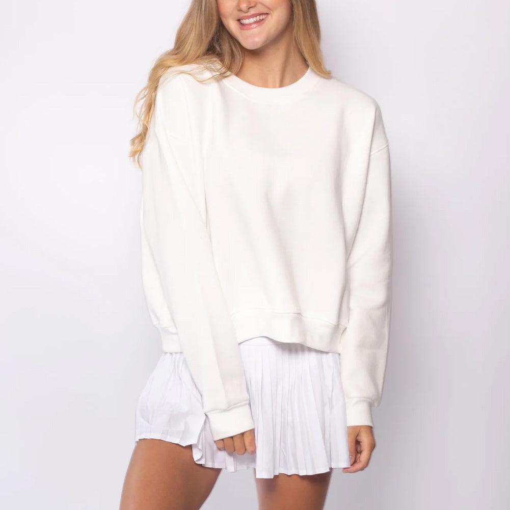 Stay cozy and stylish with the CourtLife Women's Happiest On-The Court Tennis Sweatshirt. Designed with a flattering cropped fit that sits just below the waist, it's perfect for pairing with a tennis skirt or any casual outfit. This sweatshirt is made from soft Peruvian cotton and features a ribbed neckline, cuffs, and waistband for added comfort. The back showcases an embroidered "HAPPIEST ON THE COURT" making it a go-to piece both on and off the court.