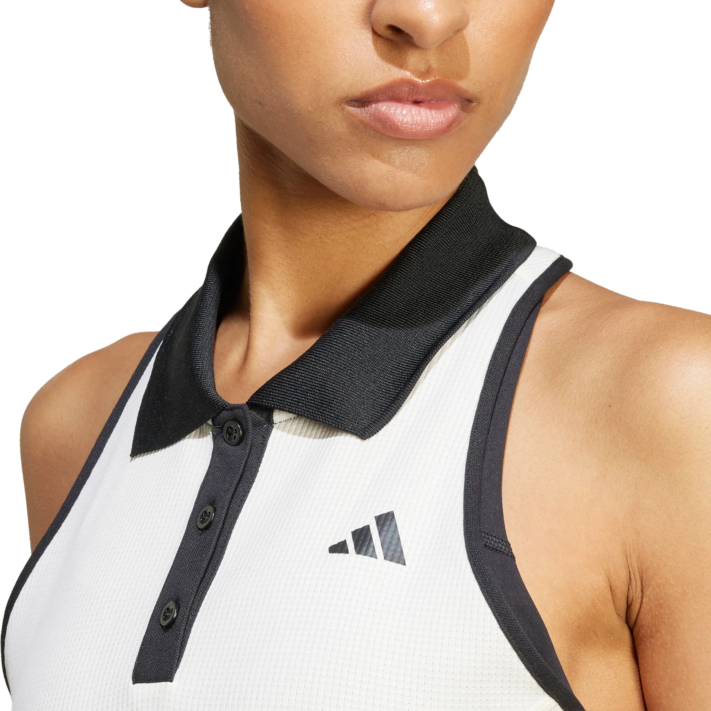 Bring classic style and modern performance to the court with the adidas Women's Heritage Tennis Dress. Designed with a timeless ribbed collar and three-button placket, this dress blends vintage-inspired aesthetics with cutting-edge functionality. The racerback design allows for unrestricted movement, while AEROREADY moisture-wicking fabric keeps you feeling dry and comfortable throughout every match. A coordinating separate shortie provides added coverage and support, making this dress a perfect choice for confident play. Finished with an adidas logo at the left chest, this piece is a must-have for players who want style and performance in one.