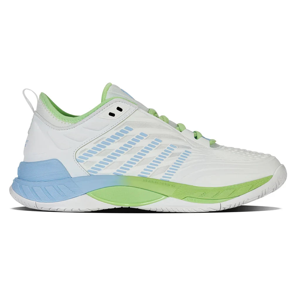 The K-Swiss Women's Hypercourt Supreme 2 Tennis Shoe is an update to one of K-Swiss's most popular tennis shoes. Key features are a more secure fit, increased support, and more outstanding durability while maintaining maximum comfort. The Durawrap X upper provides support and drag protection while keeping a flexible feel as you track down the next ball. The Dual-density midsole utilizes the lightweight Surgelite external foam for maximum comfort and support. A high rebound Shock Spring inner foam on the forefoot allows a quicker reaction in every step. The Dragguard 7.0 rubber outsole is formed into a modified herringbone tread pattern for traction and durability on all court surfaces. The newly engineered soft bootie collar gives a more secure fit around the ankle.