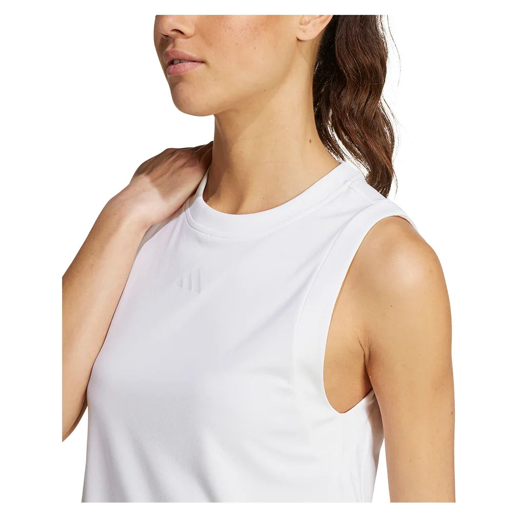 Get ready to earn your next title in the Adidas Women's Match Tennis Tank. This tank is a real show-stopper! It has a high, rounded neck, oversized armholes, and a wavy pattern. It also has crisscross seams at the bottom of the back of the tank and is made with AEROREADY technology so you can experience temperature control no matter if you are playing on clay or hard courts. Be sure to pair this tank with other Adidas apparel made only for London 2022!