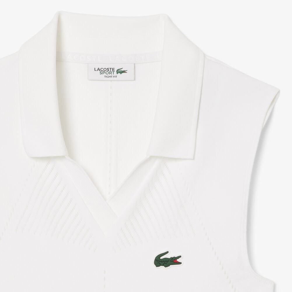 The Lacoste Women's On Court Sleeveless Tennis Polo combines performance and sophistication, making it a must-have for intensive tennis sessions. Crafted from lightweight, breathable Ultra Dry stretch fabric, this polo delivers superior moisture-wicking properties to keep you cool and comfortable during play. A mesh back panel enhances airflow, while the slim, sleeveless design allows for maximum freedom of movement. Made from recycled polyester, it reflects Lacoste's commitment to sustainable craftsmanship. Finished with the iconic silicone crocodile on the chest, this polo is the perfect blend of elegance and athletic functionality.