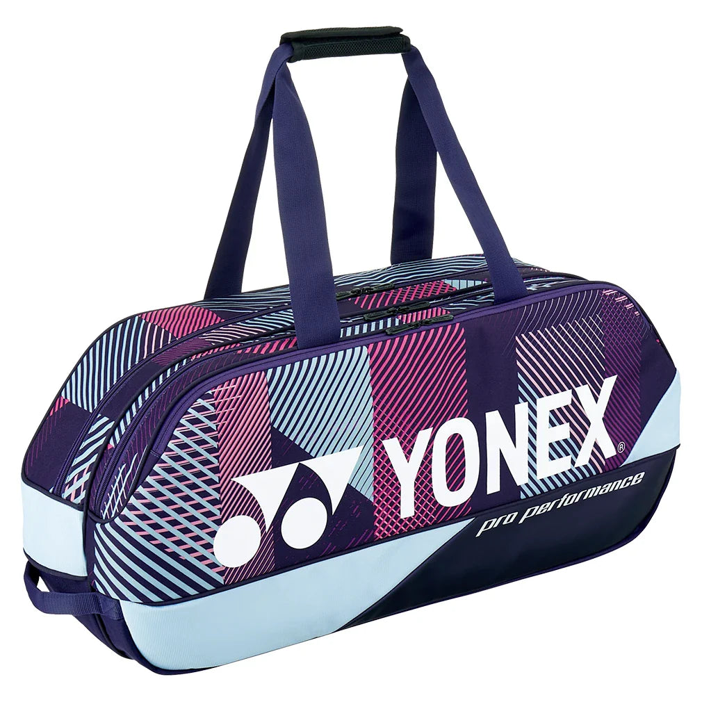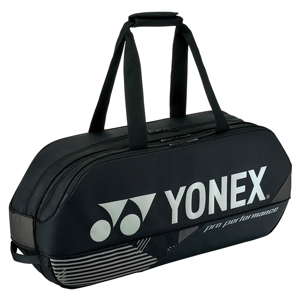Get a stylish easy-to-carry bag with plenty of storage with the Yonex Pro Racquet 6-Pack Tennis Bag. This pack gets newly upgraded with an enhanced shape retention she'll. Though smaller in size, it still allows you to carry up to 6 racquets in the two larger main compartments. On each side are two large zippered accessory pockets for storing your accessories and smaller gear. The bottom features a separate wet/shoe pocket for storing clothes or extra shoes. On top are removable/adjustable shoulder straps and a grab handle making it easy to carry to/from the court.